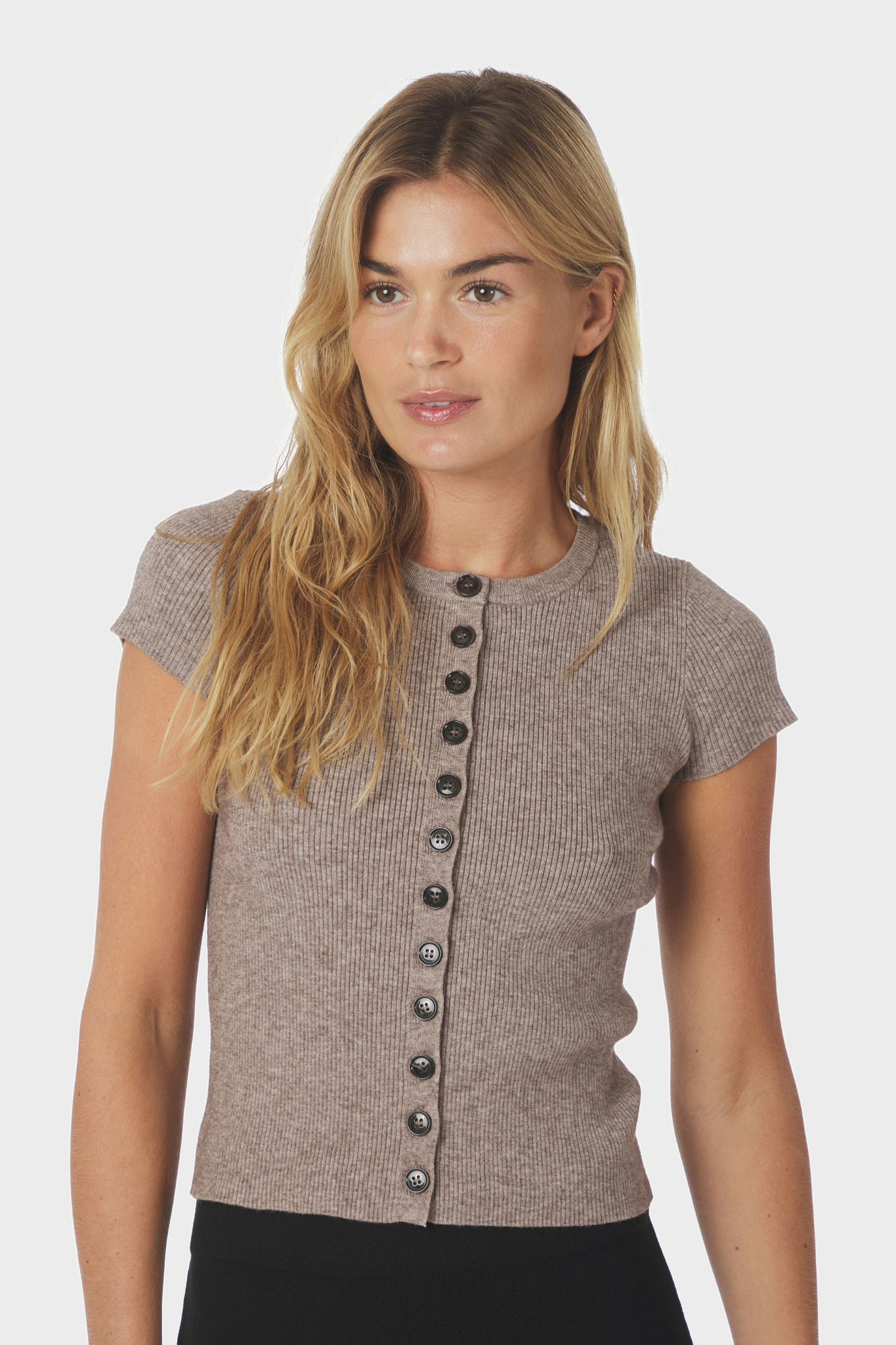 De Todda Knit Tee van Neo Noir is een gebreid T-shirt in Brown Melange met een ronde hals en korte mouwen. Het T-shirt is voorzien van een subtiele knoopsluiting aan de voorkant en geribde boorden, waardoor het een stijlvolle en comfortabele basic is voor dagelijkse looks.