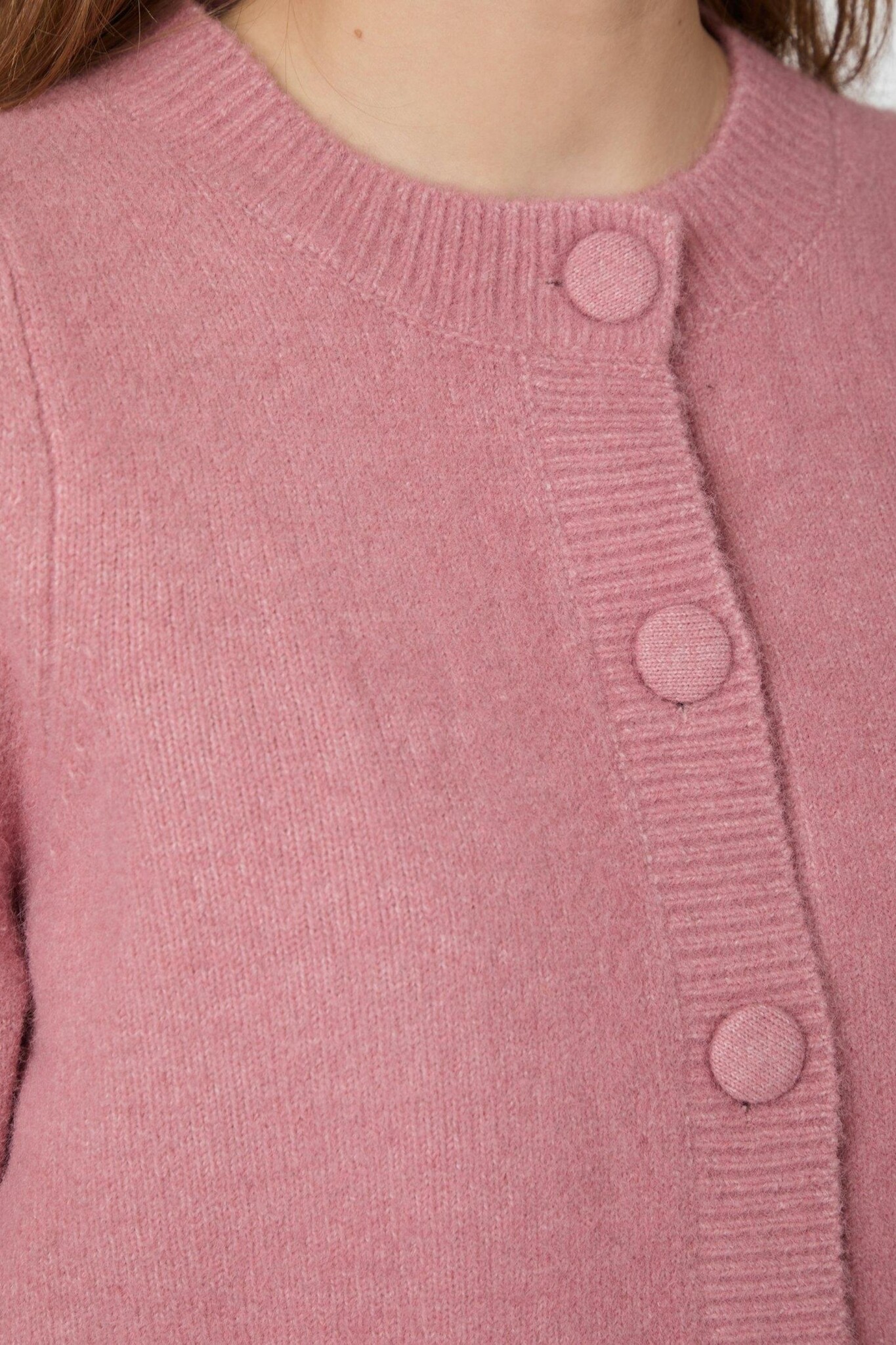 De Trudy Knit Cardigan van Neo Noir is een gebreid vest in een roze kleur. Het item heeft een ronde hals en korte pofmouwen. Het vest heeft een doorlopende knoopsluiting met knopen die zijn gemaakt van dezelfde stof als het vestje. De geribde boorden zorgen voor een klassieke afwerking.