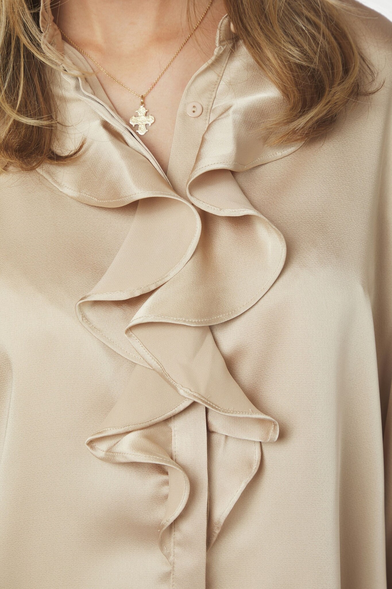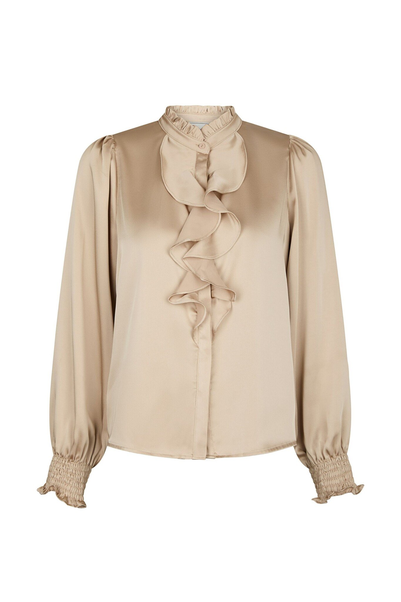De Zamola Blouse van Neo Noir is een elegante top in de kleur Dark Sand met een luxe, zijdeachtige glans. Het model valt op door de verfijnde ruches langs de opstaande kraag en de soepelvallende pofmouwen die zorgen voor een romantisch silhouet. Deze satijn-look blouse is een stijlvolle keuze voor zowel een zakelijke outfit als een feestelijke gelegenheid.