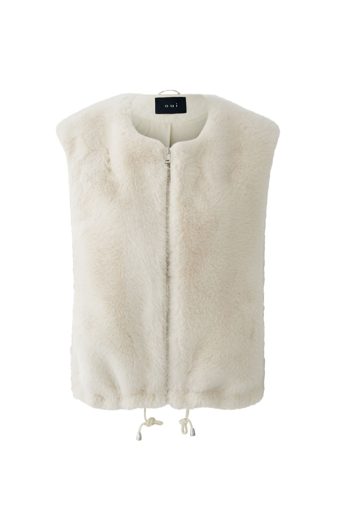 Het gilet van het merk Oui is een mouwloos model van zachte faux fur in een warme beige tint. Het gilet is voorzien van een ritssluiting aan de voorzijde en een strikceintuur in de taille, waarmee je het silhouet vrouwelijk kunt accentueren. Ideaal als extra laag op frisse dagen.