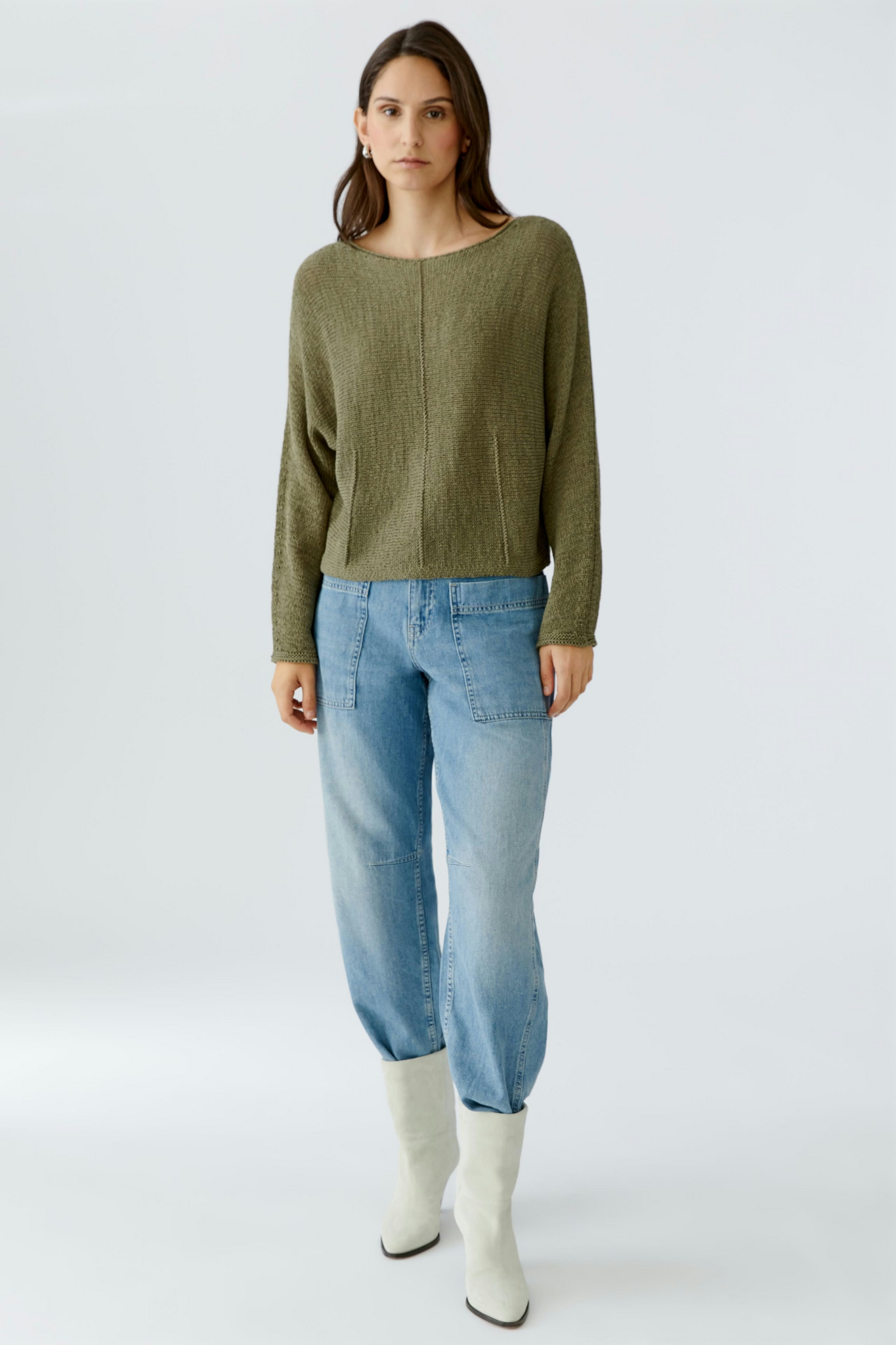 pullover van het merk Oui is een fijngebreid model in ribbon yarn kwaliteit met een casual pasvorm en verkorte lengte. De trui is horizontaal gebreid en voorzien van subtiele ingebreide coupenaden die zorgen voor een mooie belijning. De boothals met fijne rolrand en de lange mouwen met rolled edge geven het model een verfijnde afwerking. Ideaal voor het voorjaar en frisse zomerdagen.