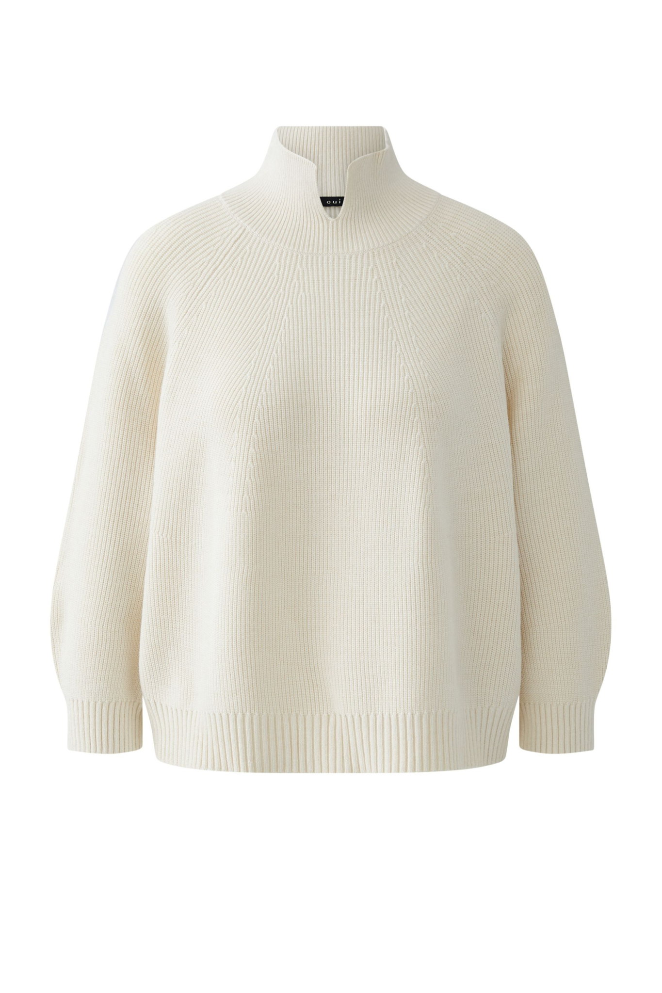 De Pullover van Oui is uitgevoerd in off-white en heeft een opstaande boord die kan worden omgeslagen tot een polokraag. De trui is ontworpen met 3/4-mouwen en geribde boorden, wat zorgt voor een moderne en comfortabele uitstraling.
