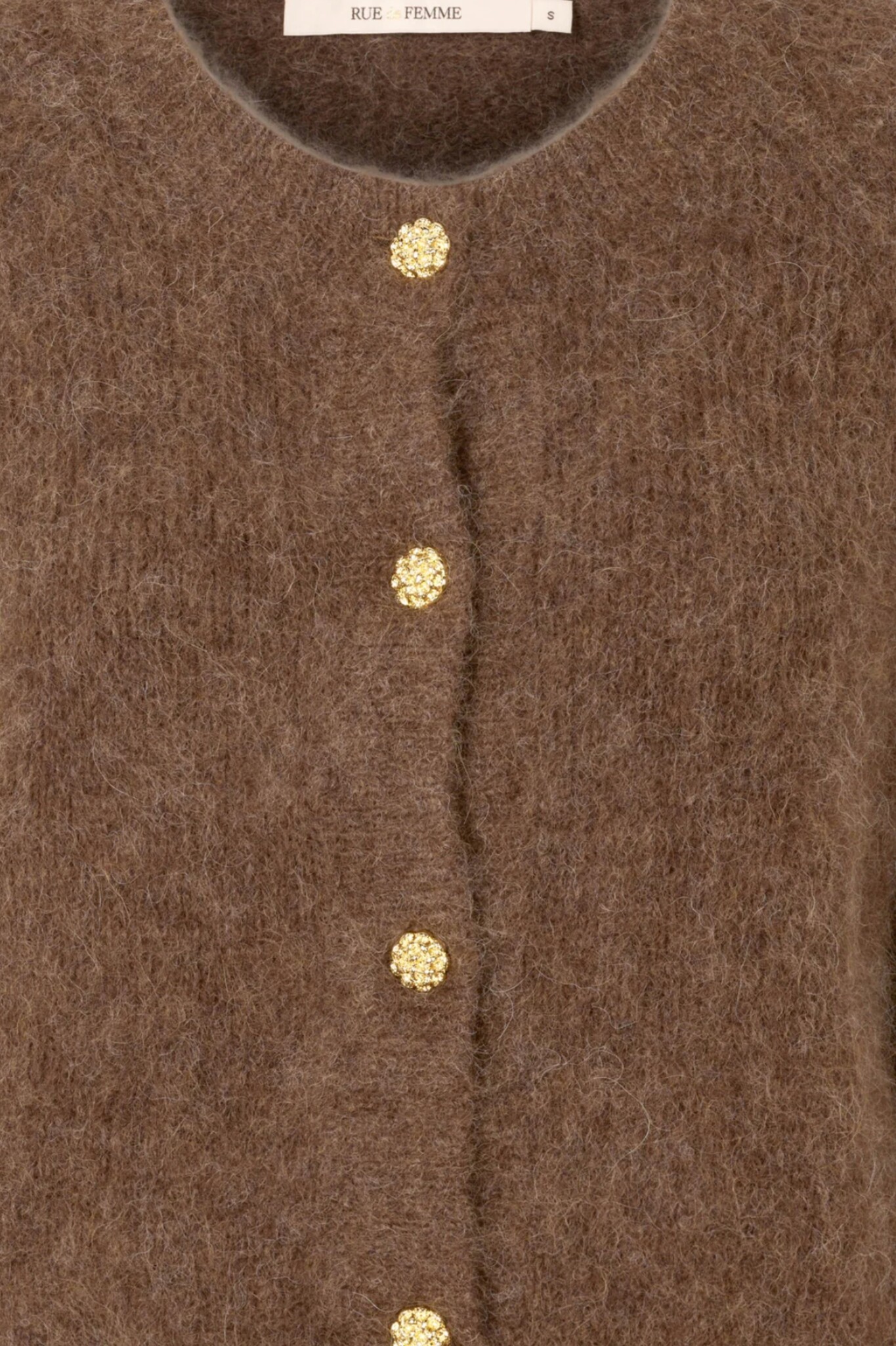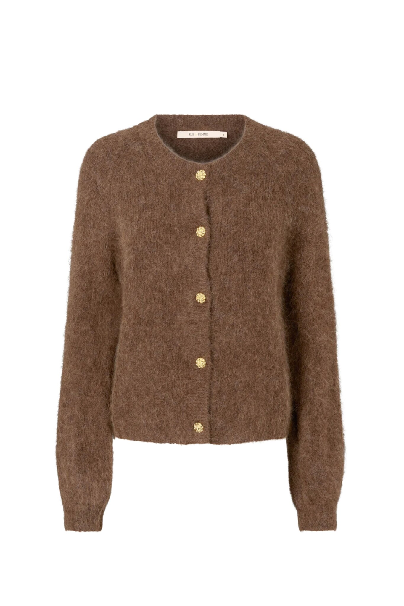 De Alpa New Leonora Knit van Rue de Femme is een heerlijk warm vest in een diepe 'bitter chocolate' kleur. Het item is gemaakt van een zachte, harige gebreide stof, heeft een ronde hals en lange mouwen. De prachtige gouden knopen zorgen voor een luxe uitstraling, terwijl de heuplengte het een perfect gilet maakt voor diverse gelegenheden.