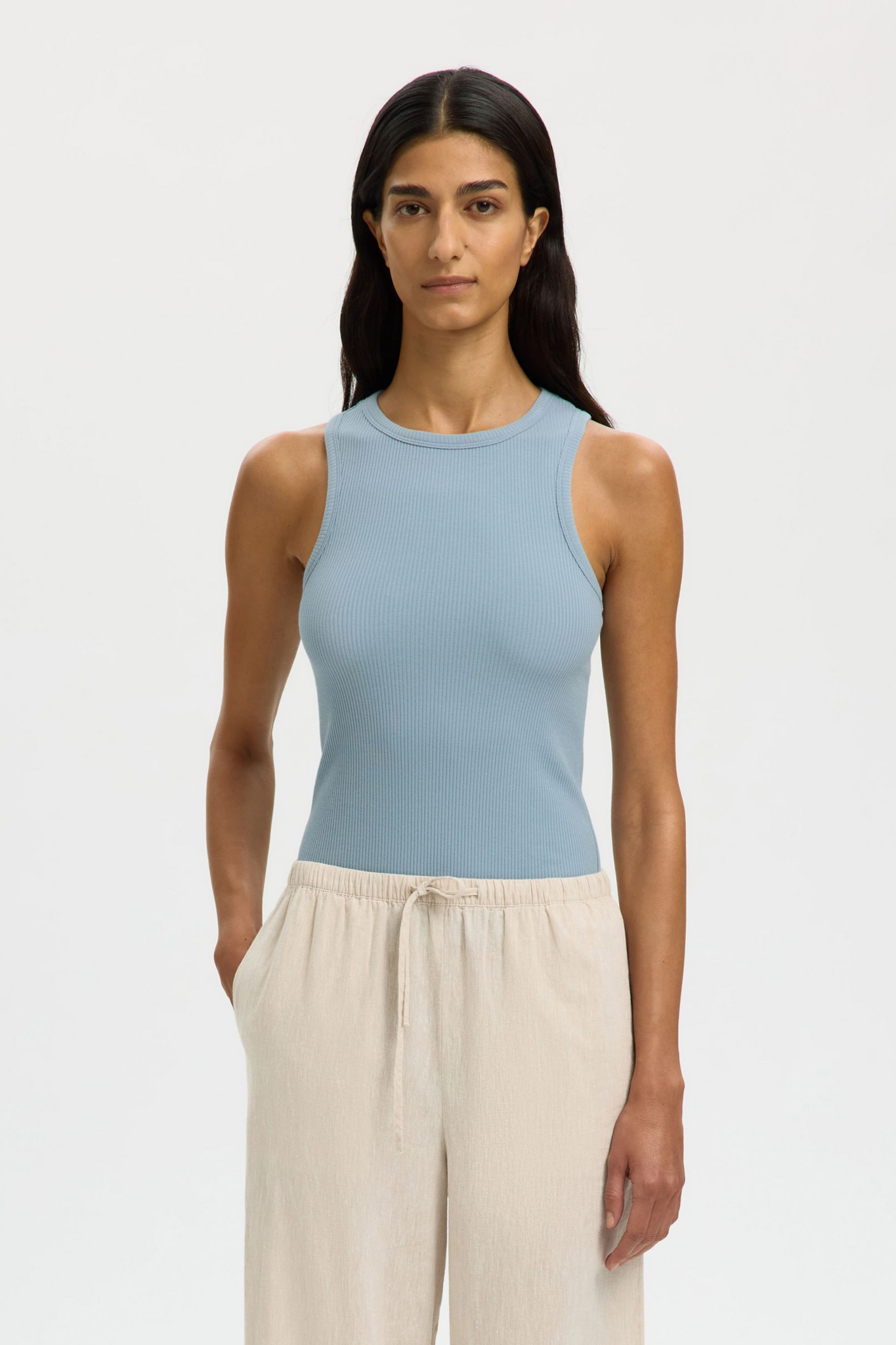 De Anna O-Neck Tank Top van Selected Femme in Dusty Blue is een aangesloten top met een ronde hals en een mouwloos model. De geribde structuur en stretchkwaliteit zorgen voor een comfortabele pasvorm die mooi aansluit op het lichaam.