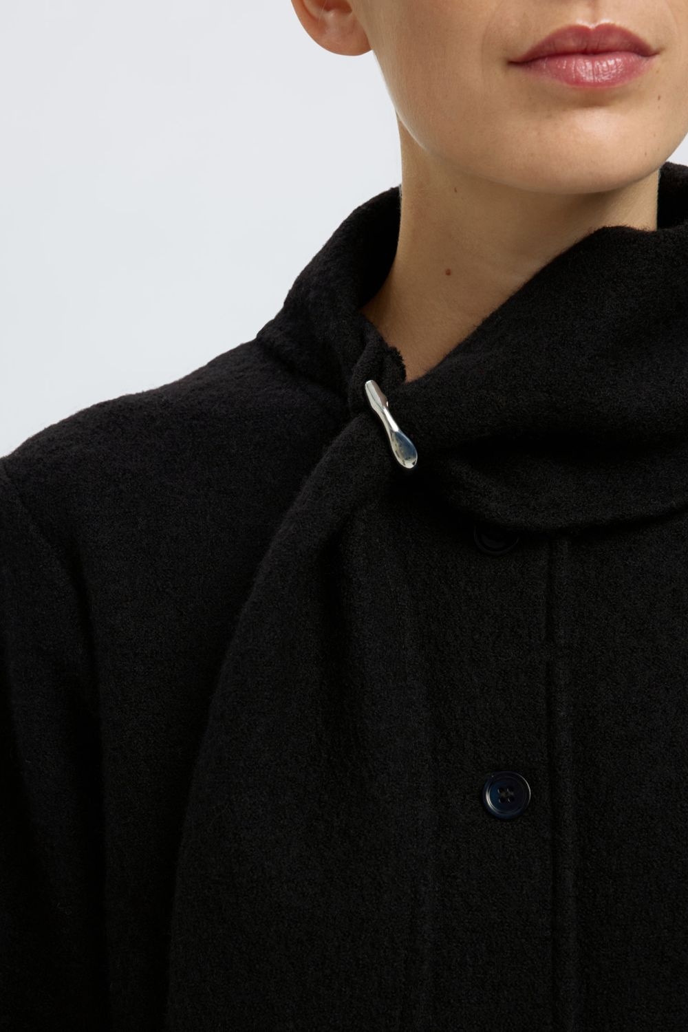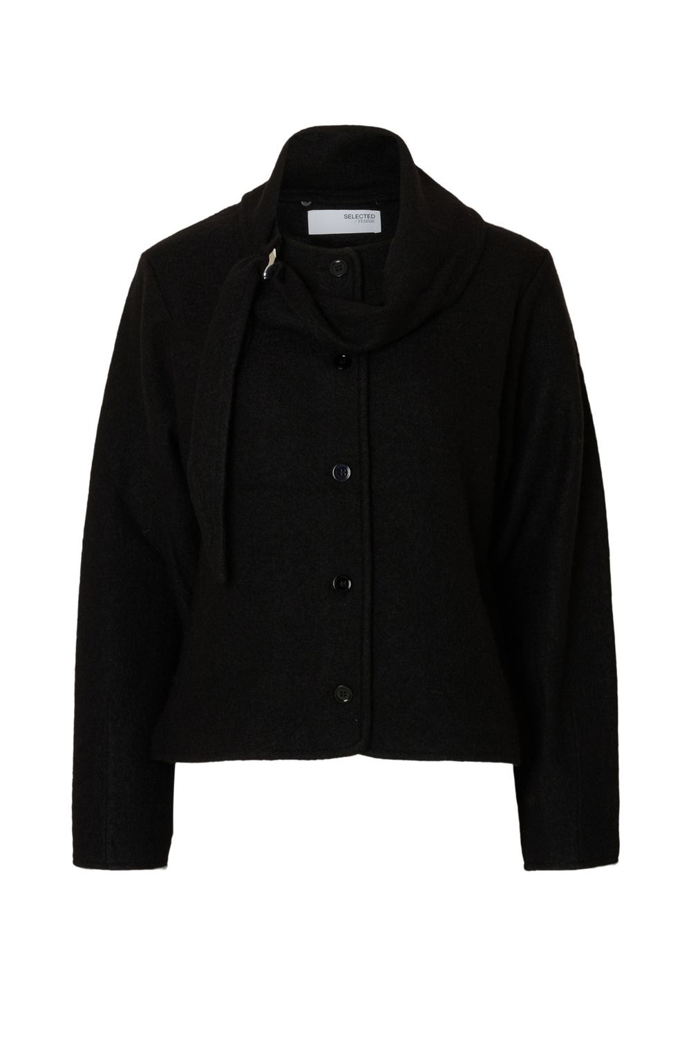 De Darla LS Knit Jacket van Selected is een kort, gebreid jasje in een zwarte kleur. Het jasje heeft een kraag met een geïntegreerde sjaal en een sluiting met een metalen gesp bij de kraag. Het item heeft lange mouwen en is voorzien van knopen. De regular fit zorgt voor een comfortabele pasvorm.