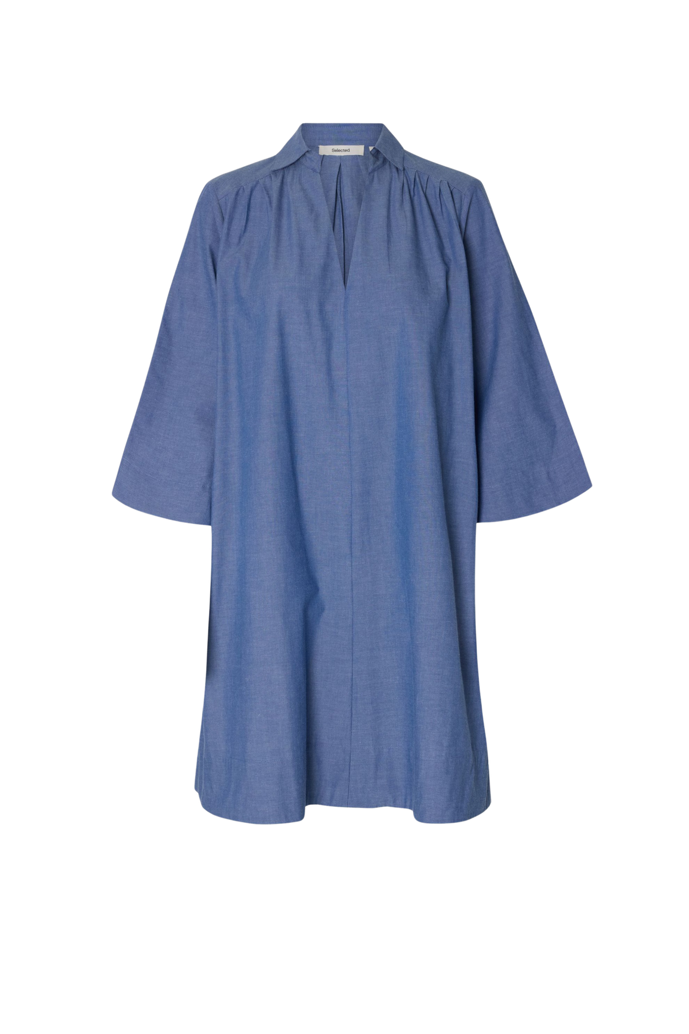 De Kira Talia Dress van Selected Femme in Dark Blue is een vrouwelijke mini jurk met een blousekraag en een V-uitsnede. Het model heeft 3/4 wijd uitlopende mouwen en lijnende details die zorgen voor een elegant silhouet. De jurk loopt wijd uit en is afgewerkt met zakken in de zijnaad.