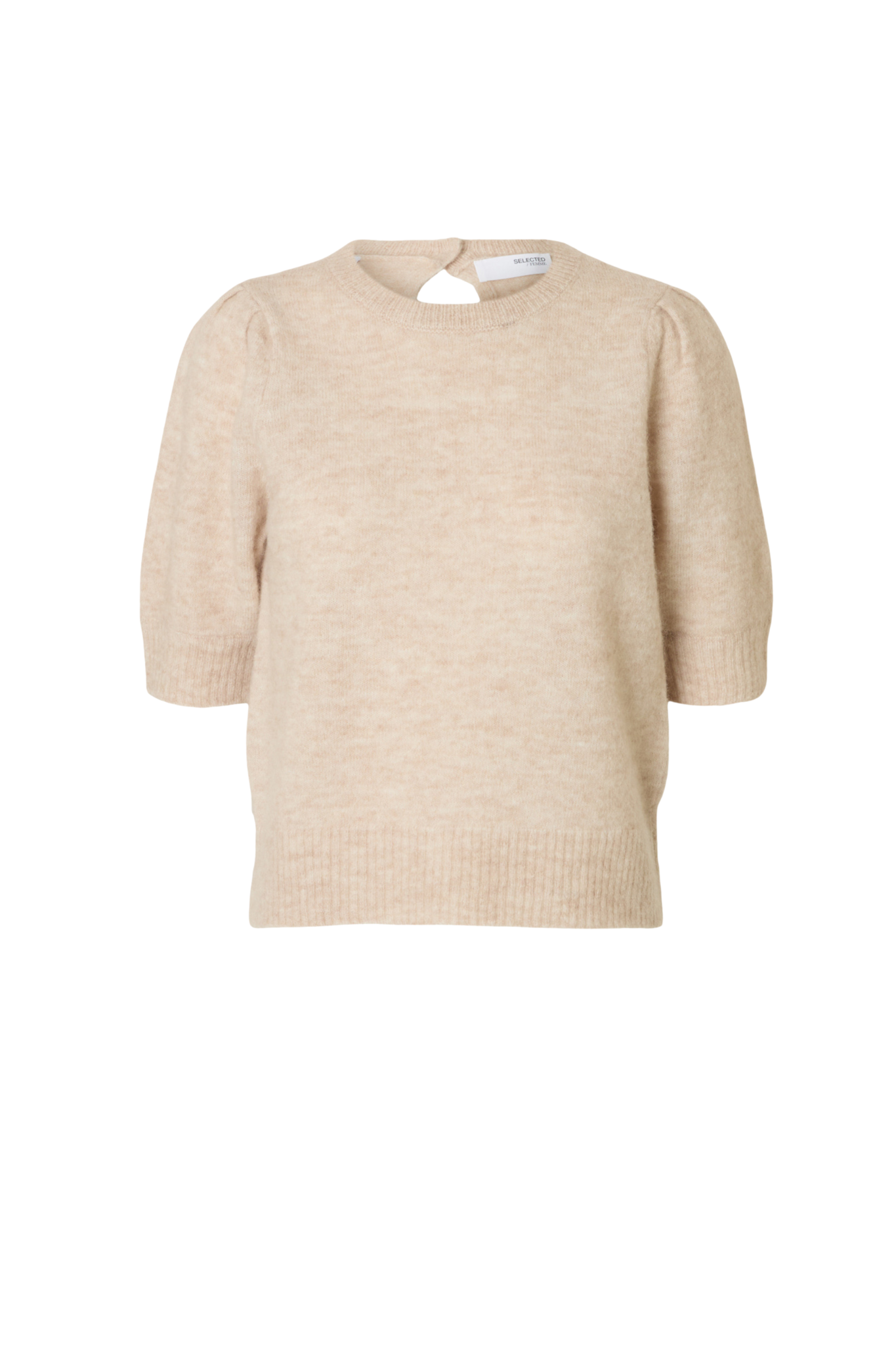 De Lulu Open Neck O-Neck van Selected is een fijngebreide top met een ronde hals, korte pofmouwen met geribde manchetten en een open rugdetail. Een elegante en vrouwelijke toevoeging aan je garderobe.