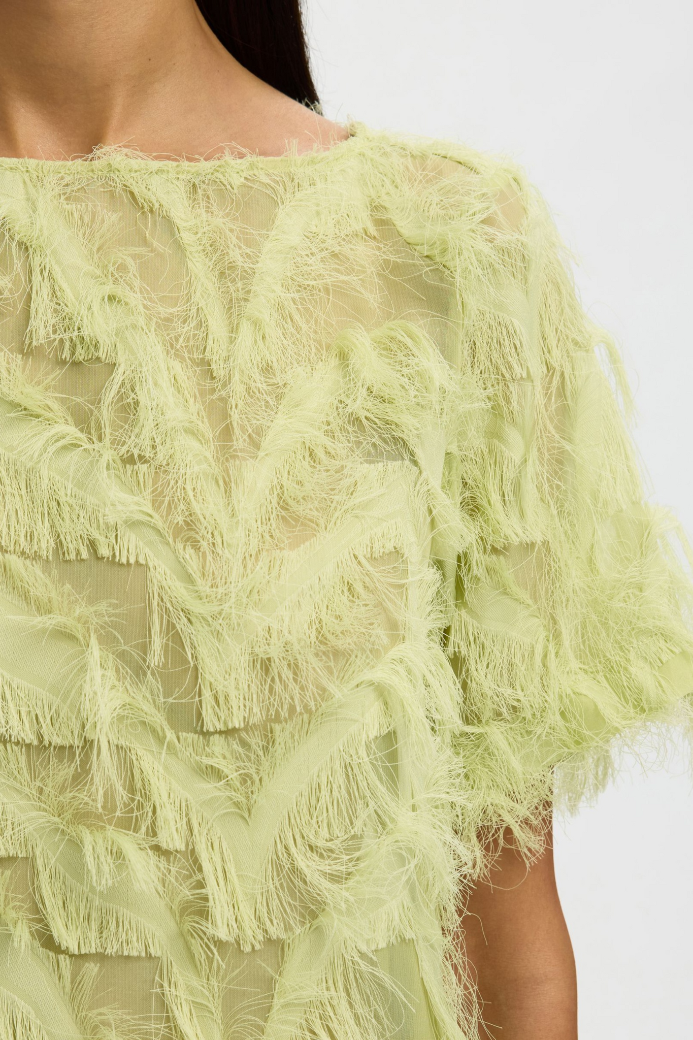 De Myline Boat Neck Top van Selected Femme in Lint is een verfijnde top met een boothals en korte mouwen. De top is afgewerkt met franjes, wat zorgt voor een subtiel en speels detail.