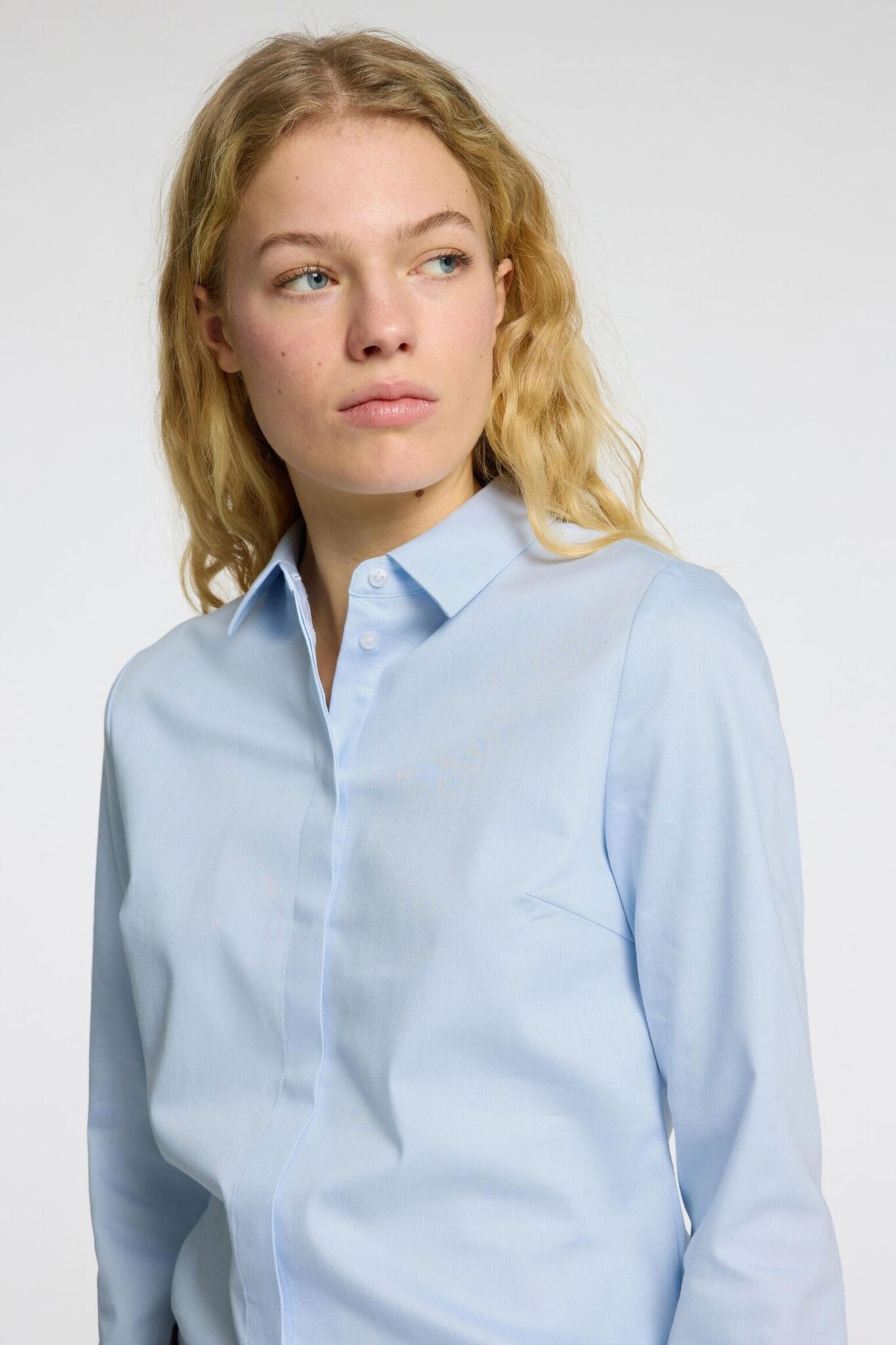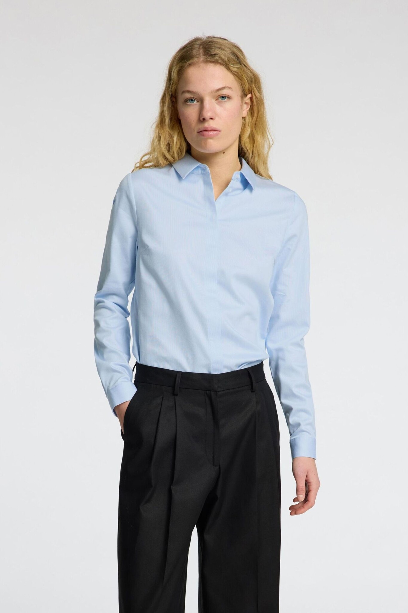 Het Romie LS Fitted Shirt van Selected is een verfijnde blouse in een tijdloze Light Blue tint met een flatterende, aangesloten pasvorm. Dit effen model is voorzien van een verborgen doorlopende knoopsluiting voor een strakke en minimalistische uitstraling. Dankzij de klassieke kraag en manchetten is dit een veelzijdige essential die perfect past in zowel een formele als casual garderobe.