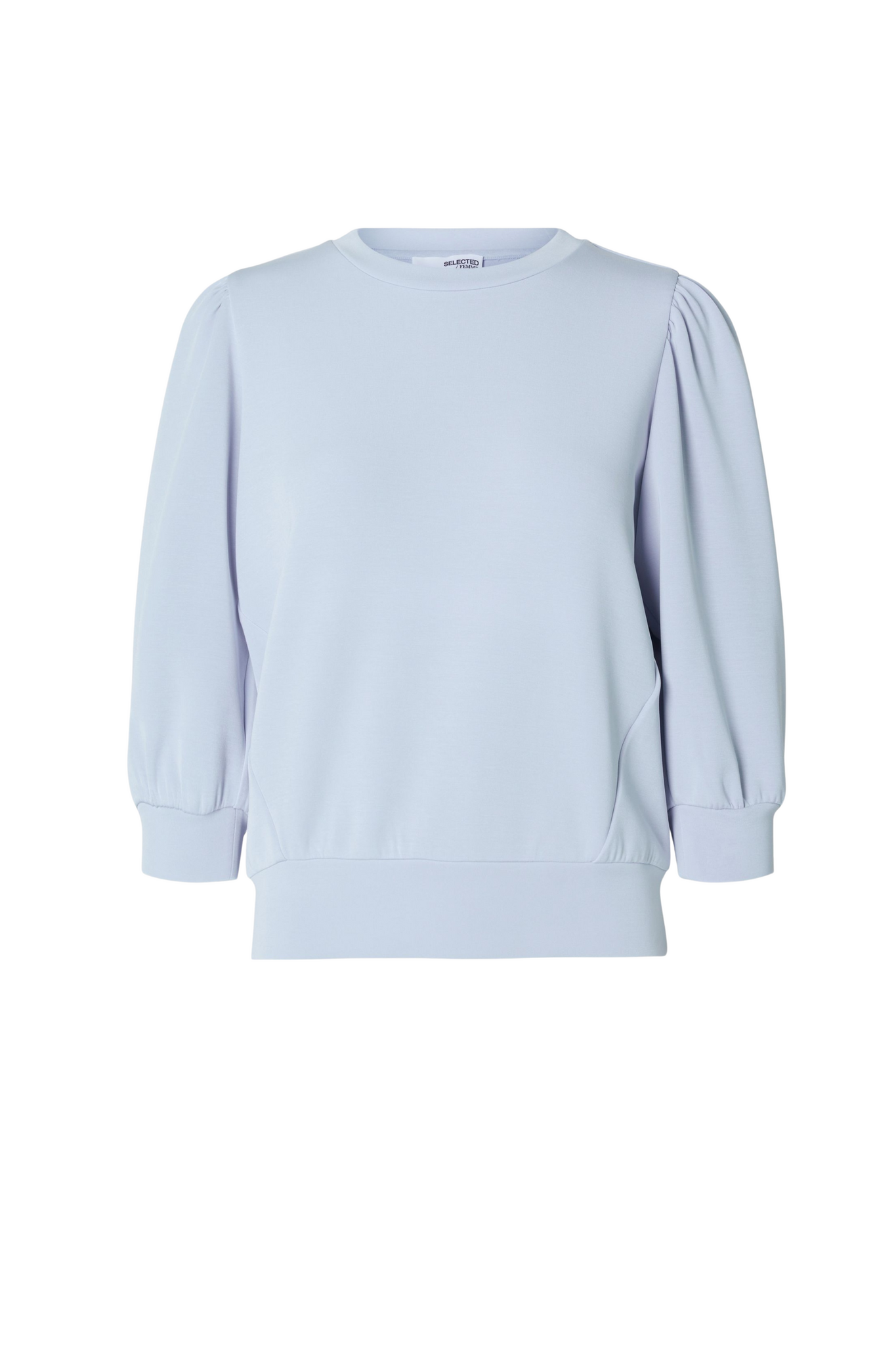 De Tenny 3/4 Sweat Top van Selected Femme in Cashmere Blue is een comfortabele sweater met een ronde hals en 3/4 pofmouwen. De mouwen zijn afgewerkt met aansluitende boorden, wat zorgt voor een mooi contrast met het lossere silhouet van de top.