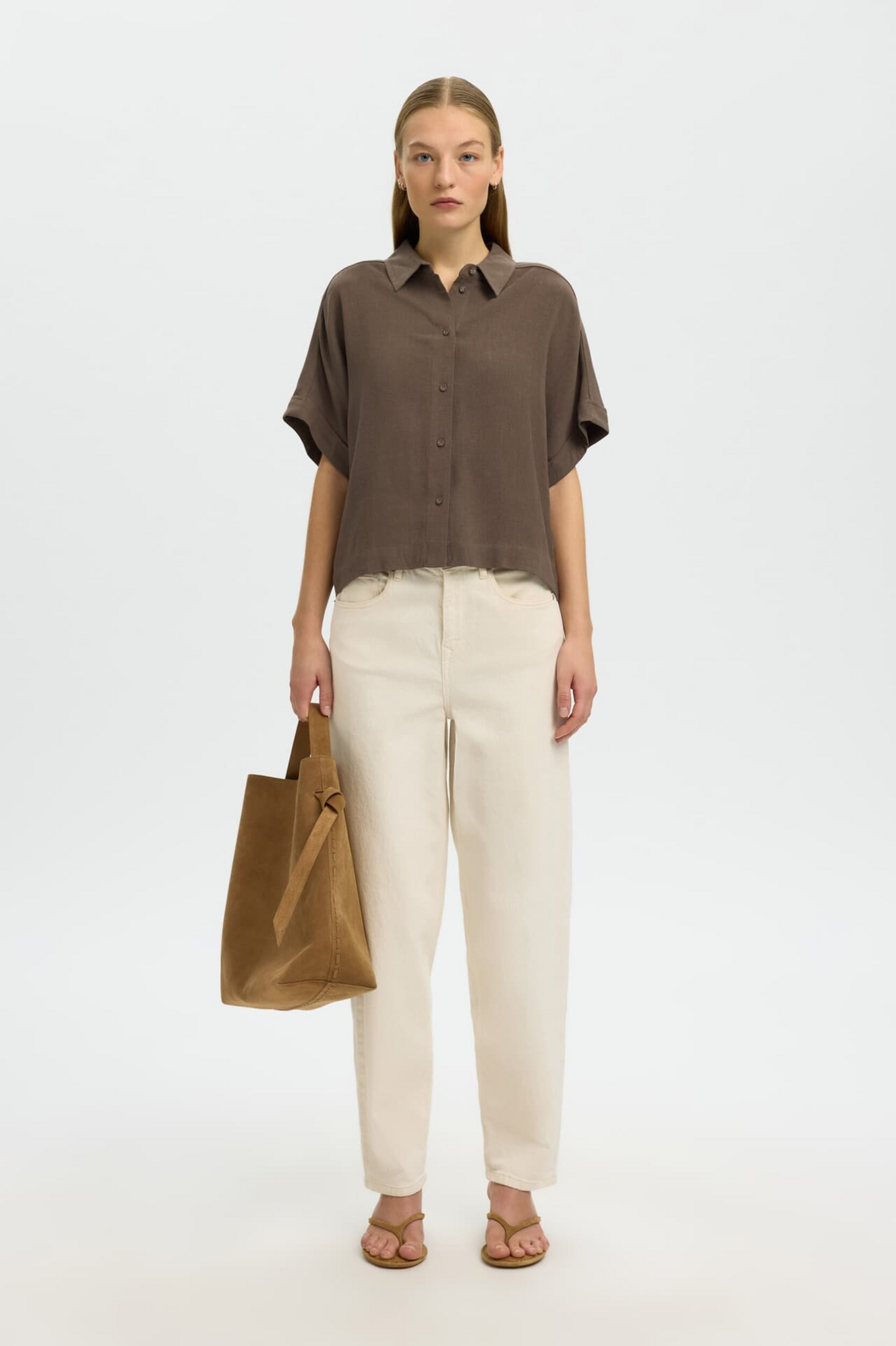 De Viva 2/4 V-Neck Top van Selected in Chocolate Chip is een luchtige linnenblend top met een ronde hals en subtiele V-uitsnede. De 2/4 uitlopende mouwen geven een elegante, losse pasvorm, terwijl de loose fit zorgt voor hoog draagcomfort. Combineer met de bijpassende rok voor een complete, stijlvolle outfit voor werk of casual gelegenheden.