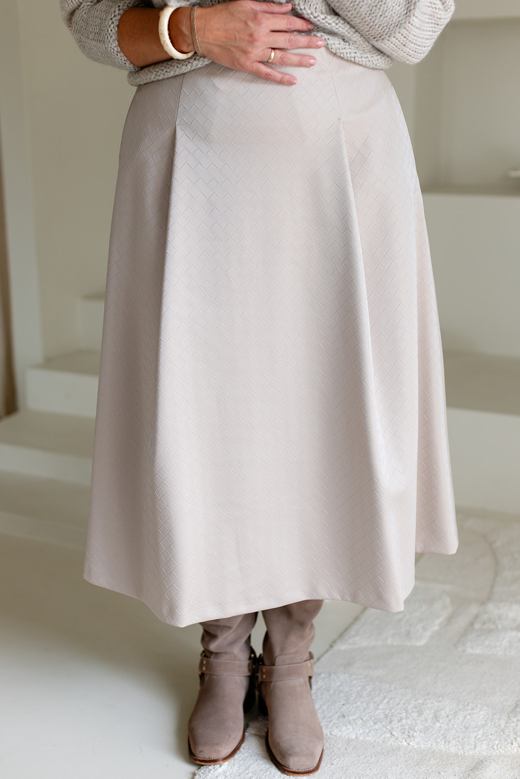 De Raymo Rok van Xandres in Almond Milk is een A-lijn midi-rok die een elegante en tijdloze uitstraling geeft. De subtiele structuur en zachte tint maken de rok ideaal om te combineren met een fijne blouse of knit, waardoor een stijlvolle en verfijnde look ontstaat.