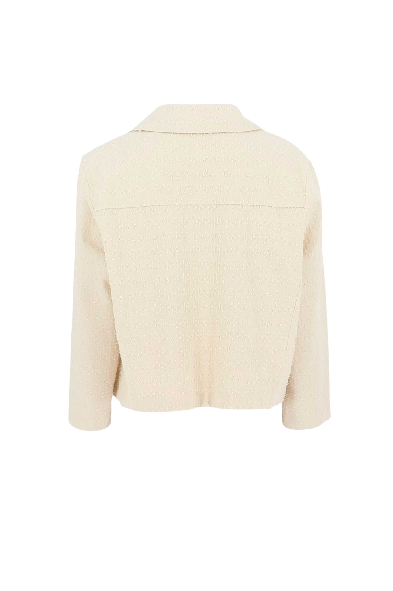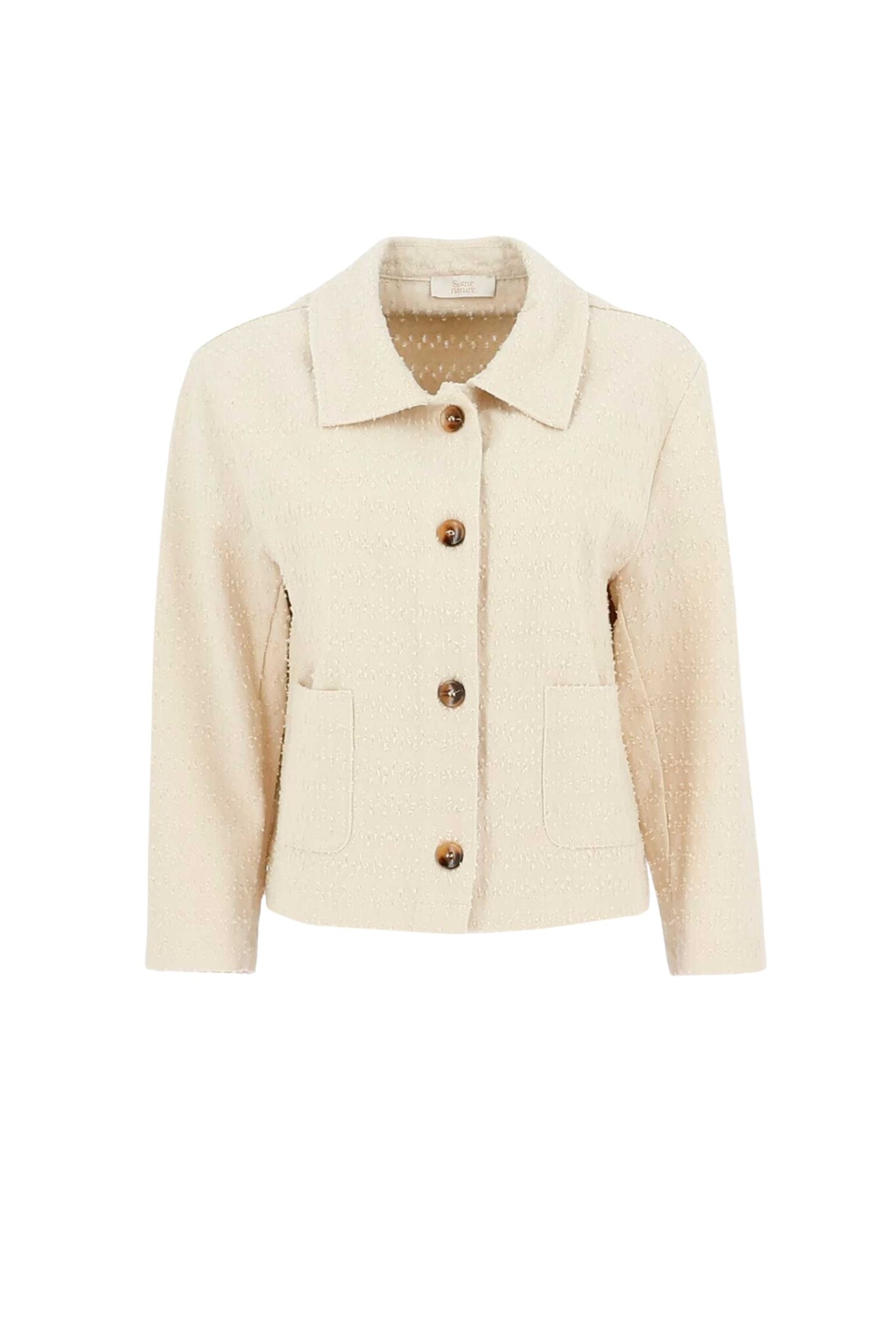 Het Signe Nature Denim Jacket in Off White is een kort, rechtvallend jasje met een getextureerde afwerking. Het model heeft een klassieke kraag, een knoopsluiting met vier contrasterende bruine knopen en twee opgestikte zakken aan de voorzijde. De subtiele structuur in de stof en de warme off-white tint geven dit denim-geïnspireerde item een verfijnde en vrouwelijke uitstraling.