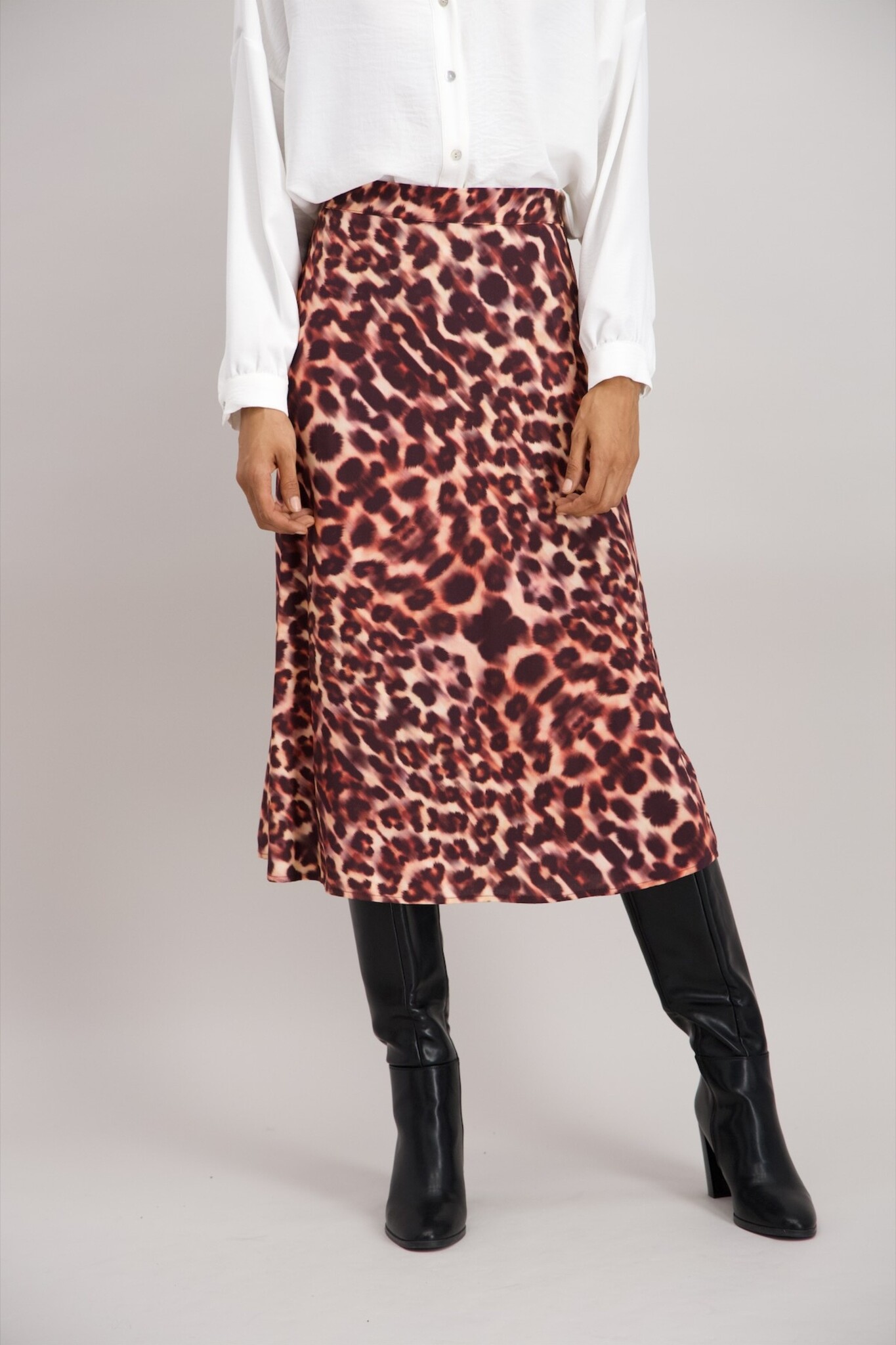 De Panter Rok van Signe Nature is een elegante midi-rok met een panterprint in roze en donkerrode tinten. De rok is gevoerd en heeft een elastische tailleband aan de achterzijde, wat zorgt voor een comfortabele pasvorm. Ga voor een complete look met de bijpassende blouse.