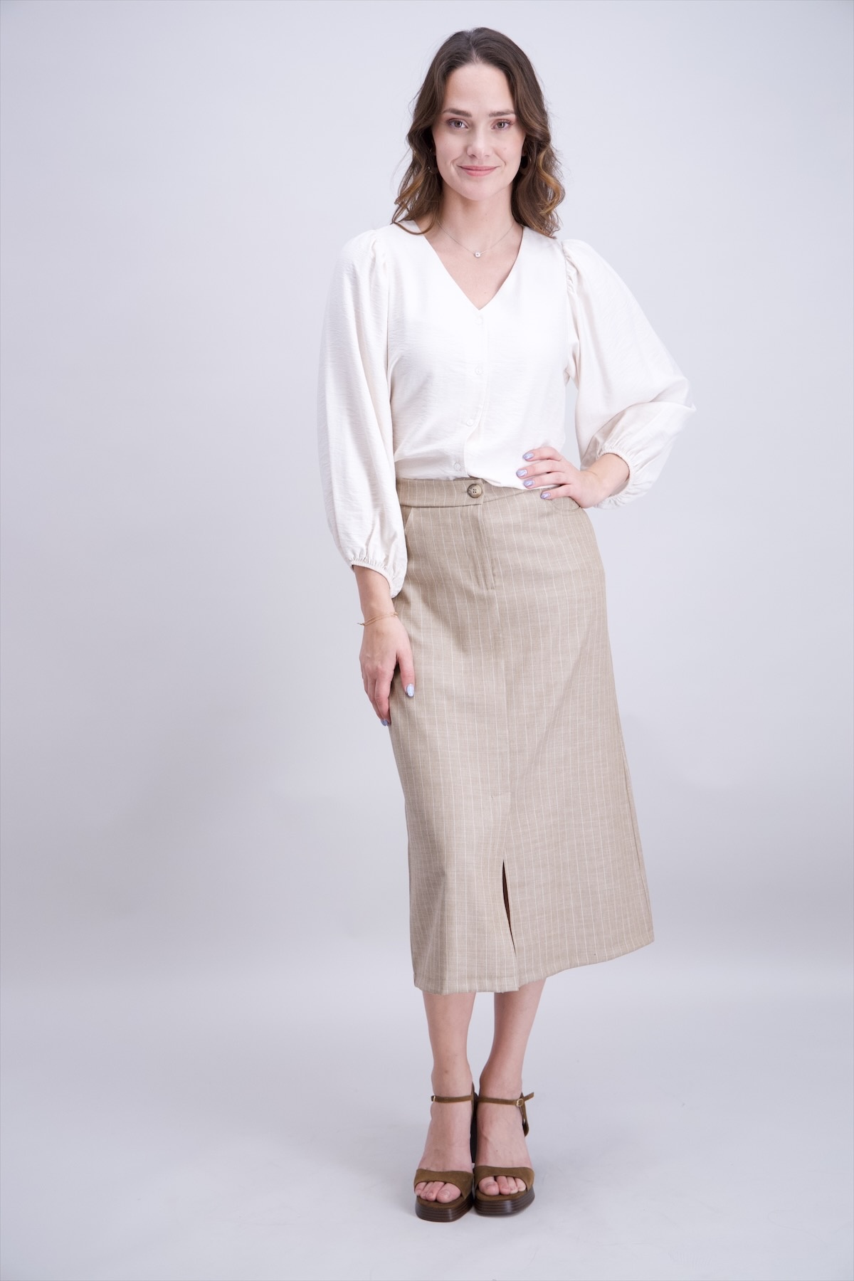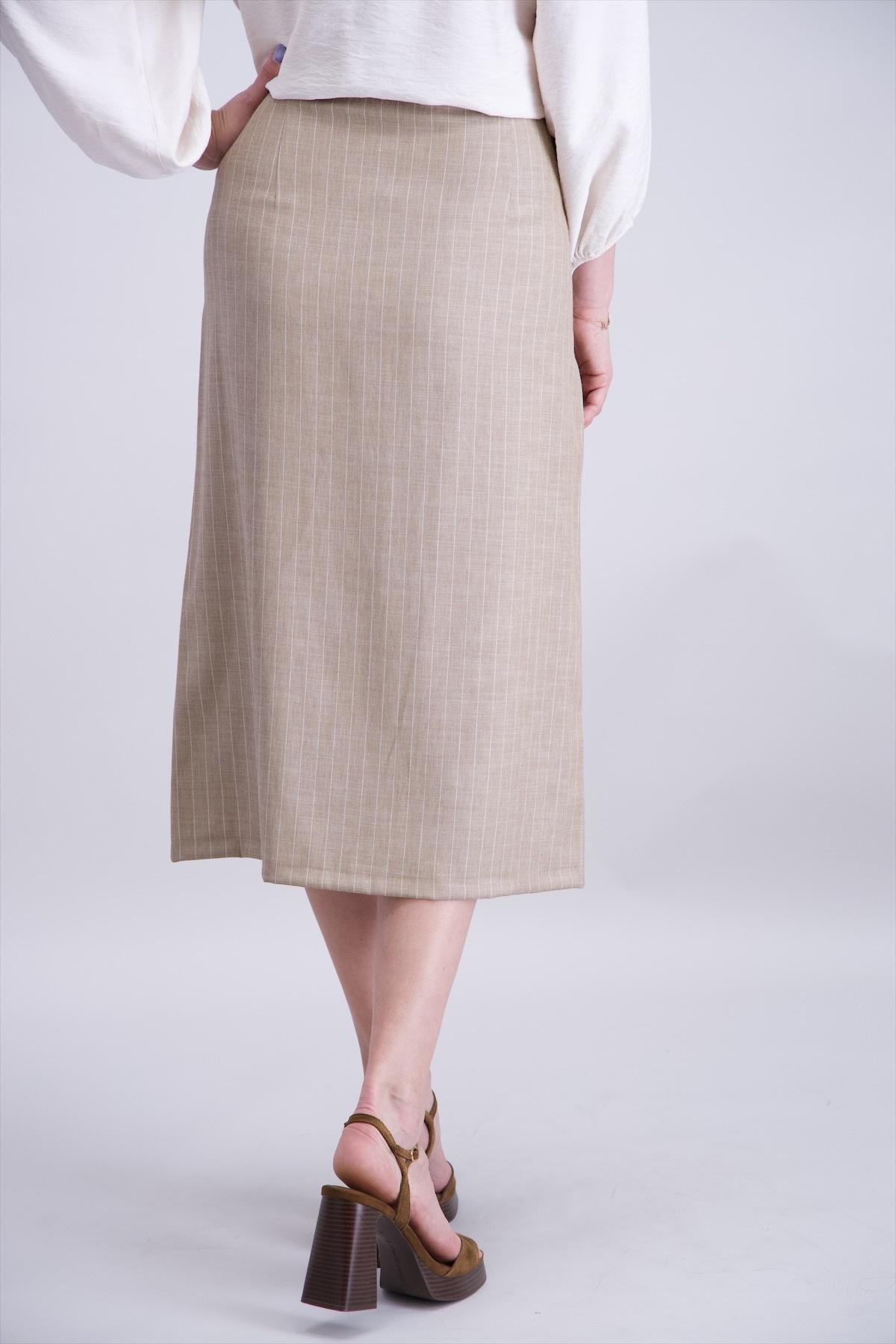De rok van het merk Signe Nature is een rechte pasvorm rok in de kleur Sand Stripe. De rok is voorzien van een knoopsluiting en handige zakken. Een subtiele split aan de voorkant zorgt voor extra bewegingsvrijheid en een moderne touch.