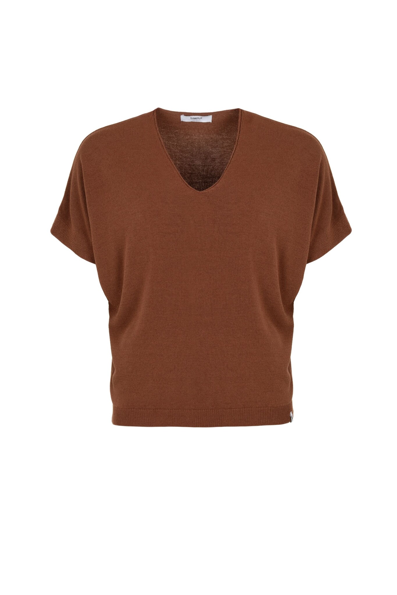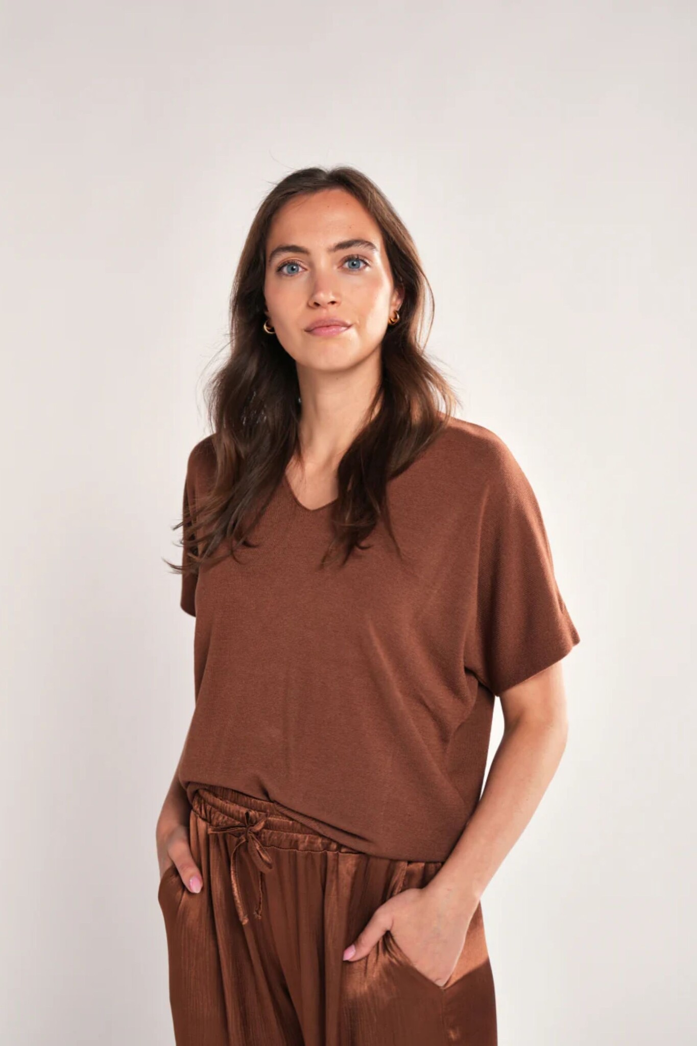 De Simple The Brand Bamba Knit in Mocca is een verfijnde, fijngebreide top met een diepe V-hals en korte, aangeknipte mouwen. Dit model is uitgevoerd in een warme mokkabruine tint en heeft een ontspannen, licht bloezende pasvorm die eindigt in een subtiele ribgebreide boord. De lichtgewicht kwaliteit en het minimalistische ontwerp maken dit een veelzijdig kledingstuk dat zowel solo als gelaagd gedragen kan worden voor een tijdloze look.