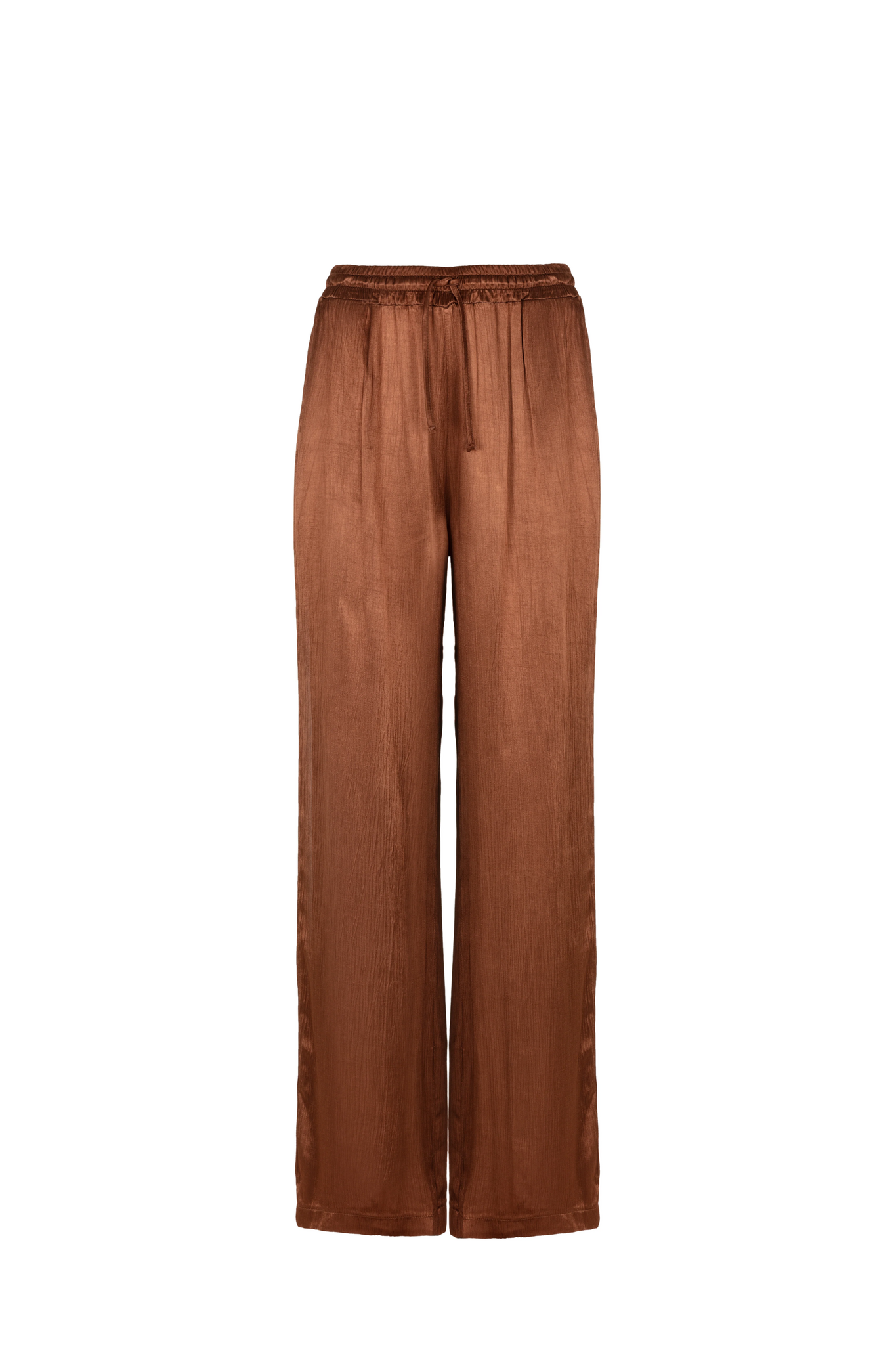 De Simple The Brand Erwald Trouser in Mocca is een stijlvolle, wijde broek die luxe en comfort moeiteloos combineert. Het model is uitgevoerd in een glanzende, satijnachtige stof met een subtiele verticale textuur in een rijke koffiebruine tint. Dankzij de elastische tailleband met een verstelbaar trekkoord biedt de broek een perfecte pasvorm en een ontspannen, chique uitstraling.