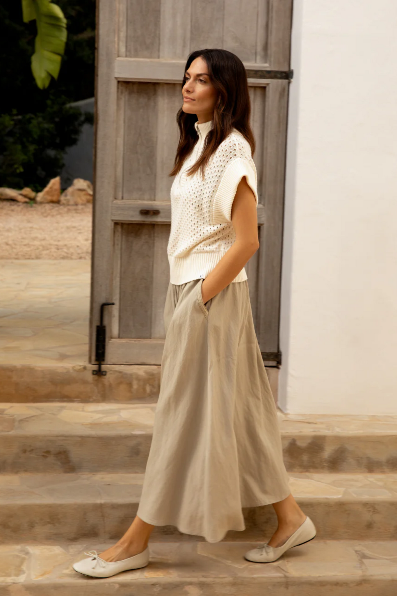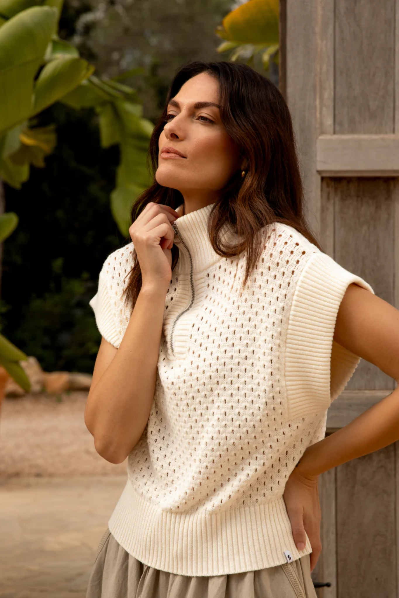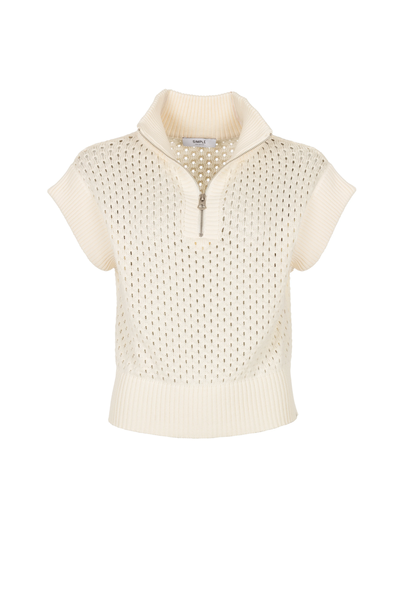 De Simple The Brand Olly Knit in Egret is een stijlvolle, mouwloze top met een unieke opengewerkte structuur. Het model kenmerkt zich door een sportieve opstaande kraag met een zilverkleurige ritssluiting, wat zorgt voor een moderne touch. Vervaardigd in een heldere gebroken witte tint en afgewerkt met brede ribgebreide boorden, is dit gebreide item perfect voor een gelaagde voorjaarslook.