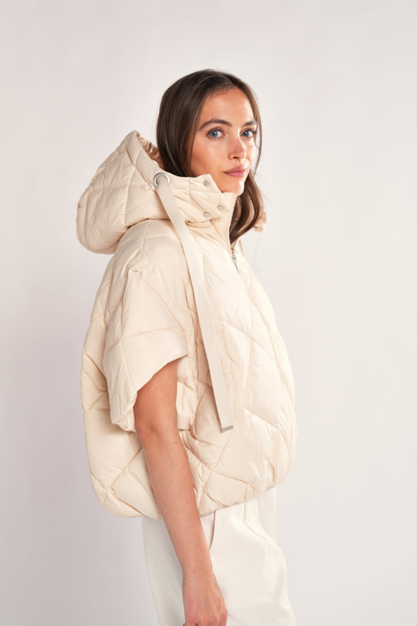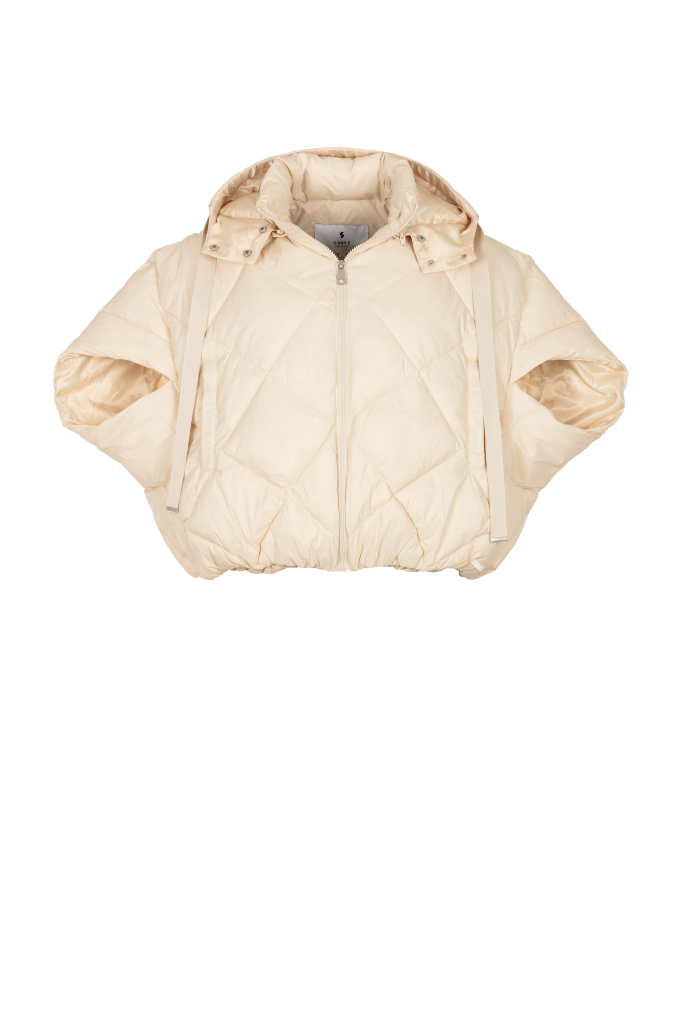 De Simple The Brand Suza Jacket in Egret is een eigentijdse, gewatteerde bodywarmer met een volumineus, oversized silhouet. Dit model in een lichte crèmekleur heeft een ruitvormig stikpatroon, een praktische capuchon met trekkoorden en een volledige ritssluiting aan de voorzijde. De wijde, korte mouwaanzet en de elastische onderzijde geven dit puffer-item een moderne en sportieve uitstraling.