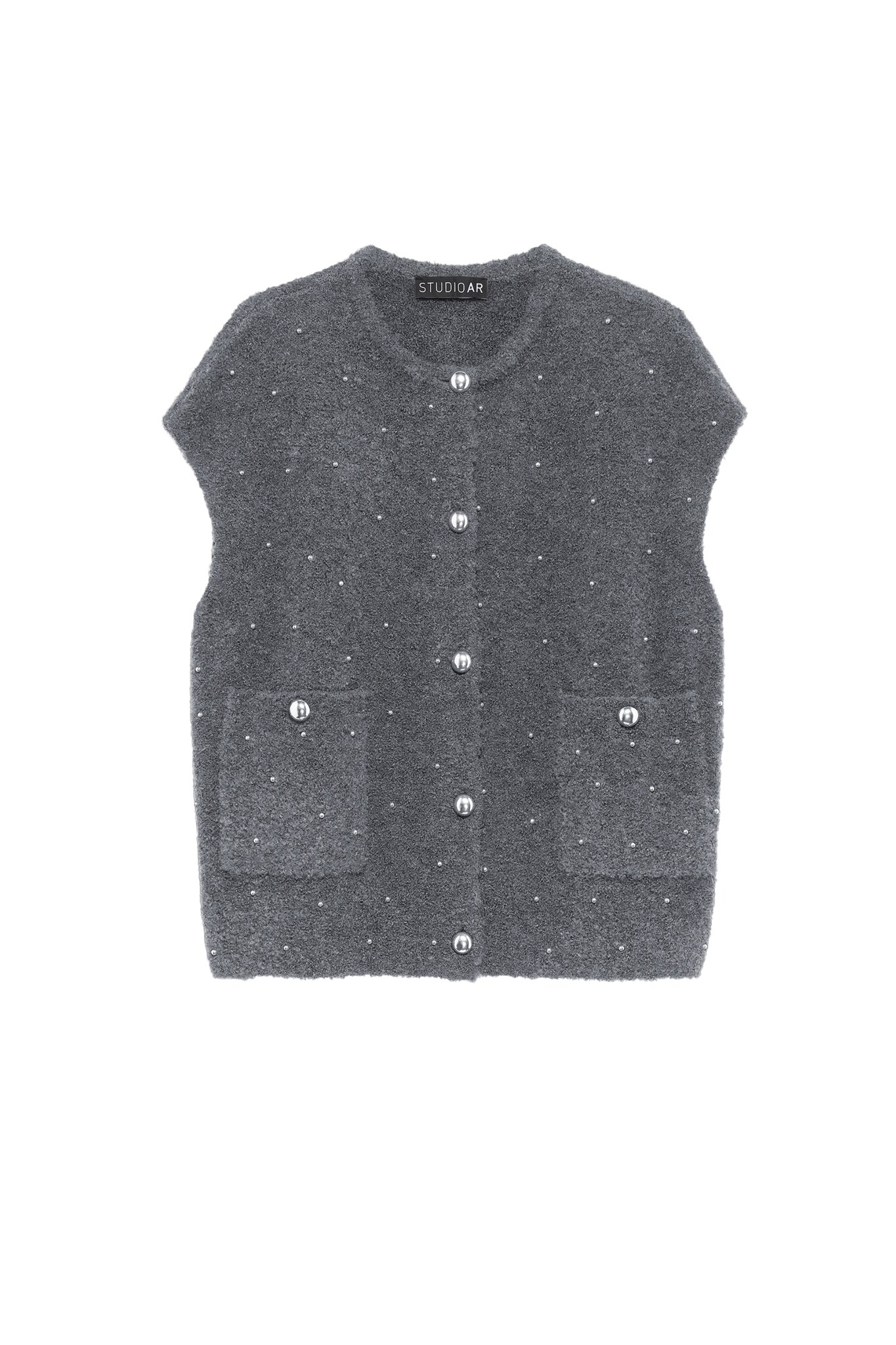 De Idony Studs Boucle Knit van Studio AR by Arma is een mouwloos vest in een grijze kleur. Het item is gemaakt van een bouclé stof en heeft een ronde hals. Het vest heeft een doorlopende knoopsluiting, steekzakken aan de voorzijde en is versierd met zilveren studs. Dit item is perfect om over een top of blouse te dragen.