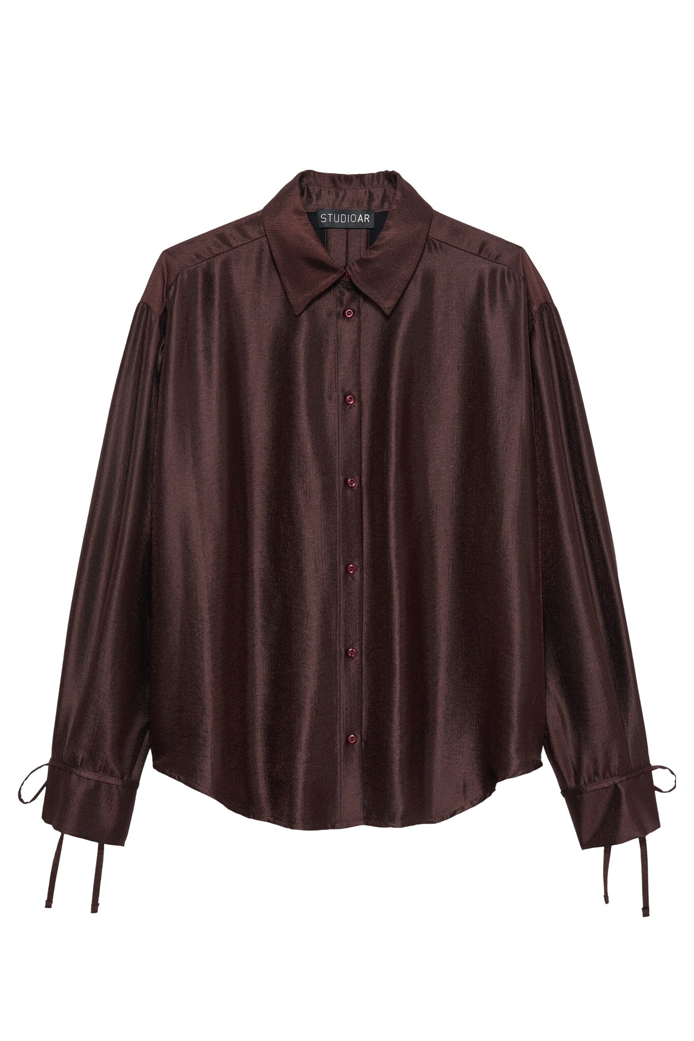 De Nona Shiney blouse van Studio AR by Arma is een elegante top in een diepe rode kleur. De blouse heeft een klassieke kraag en een doorlopende knoopsluiting aan de voorzijde. De glanzende stof geeft het item een luxe uitstraling. De lange mouwen zijn afgewerkt met strikdetails bij de manchetten.