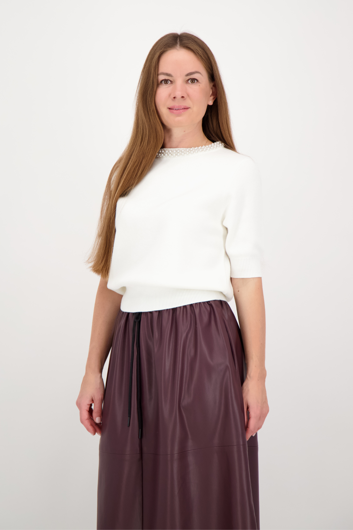 De Pearl Pullover van Suncoo is een elegante trui met korte mouwen en een ronde hals. De trui heeft geribde boorden en is afgewerkt met sierlijke parels rondom de hals voor een subtiel luxe detail.