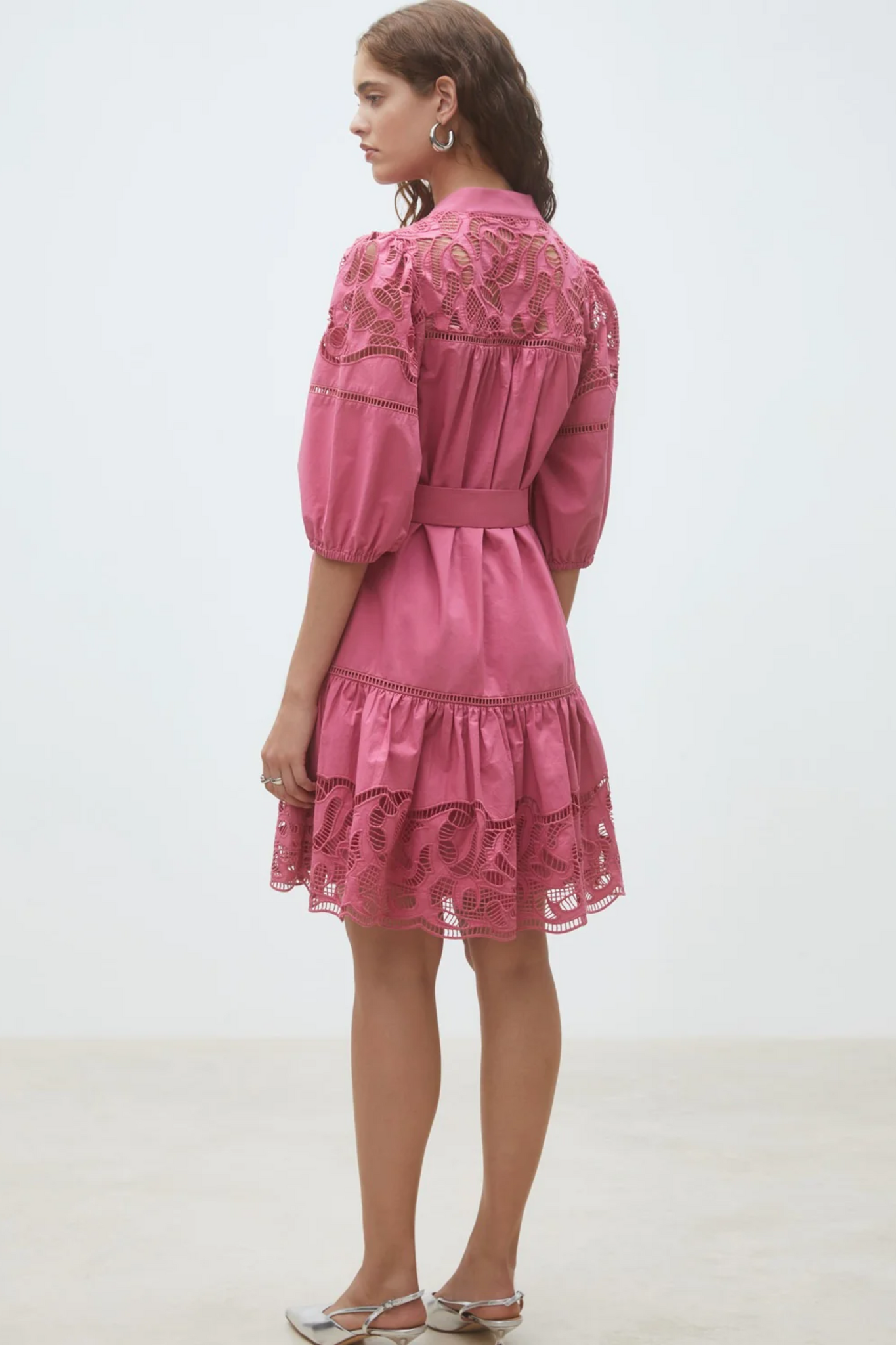 De Robe Caty Dress van Suncoo is een A-lijn jurk met een ronde hals en knoopsluiting aan de voorkant. De jurk heeft korte pofmouwen met een elastische boord en een bijpassend ceintuur in de taille. Het model is voorzien van een onderrok en afgewerkt met verfijnde broderie details op de schouders, borst en onderzijde van de jurk.