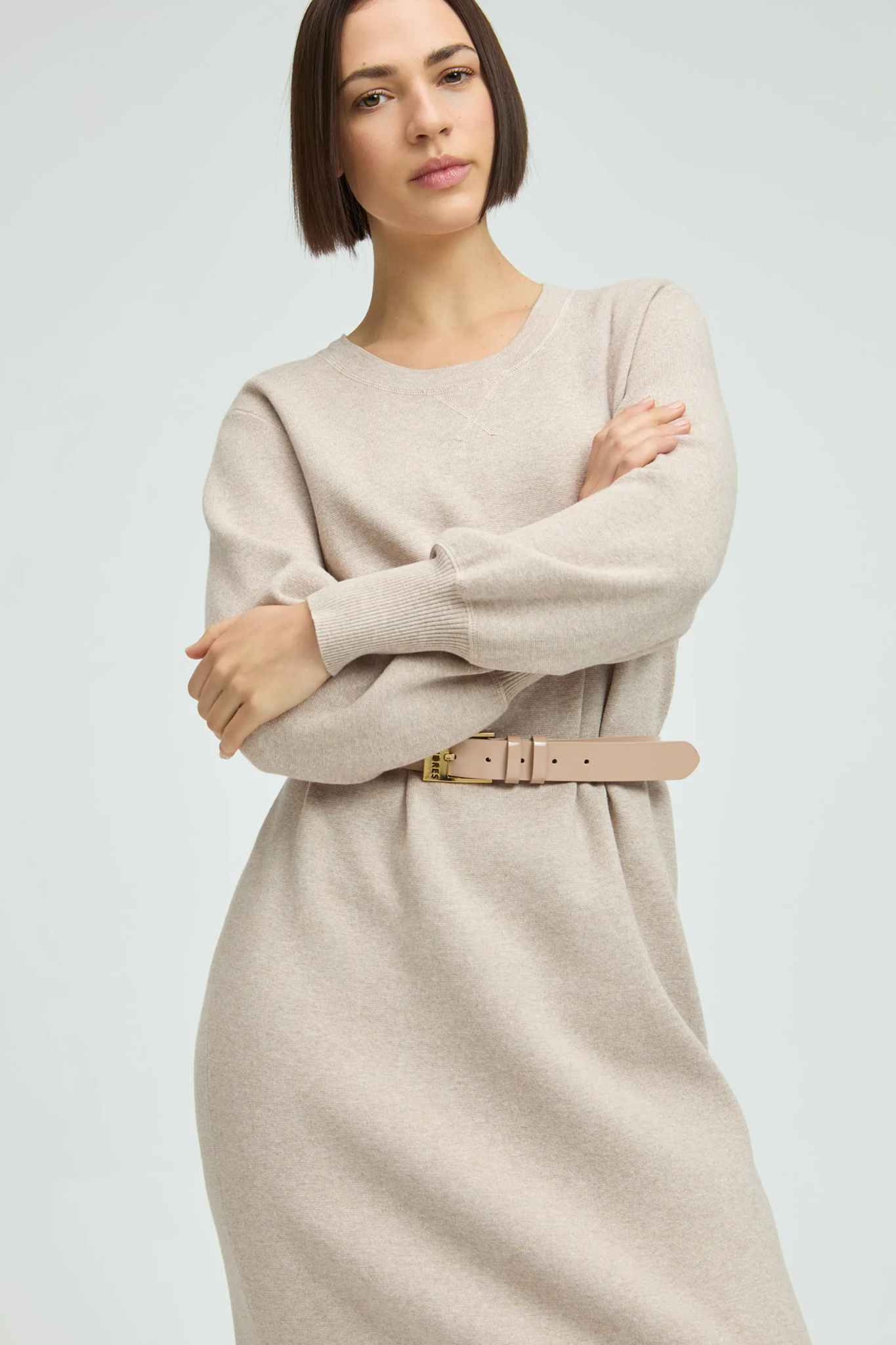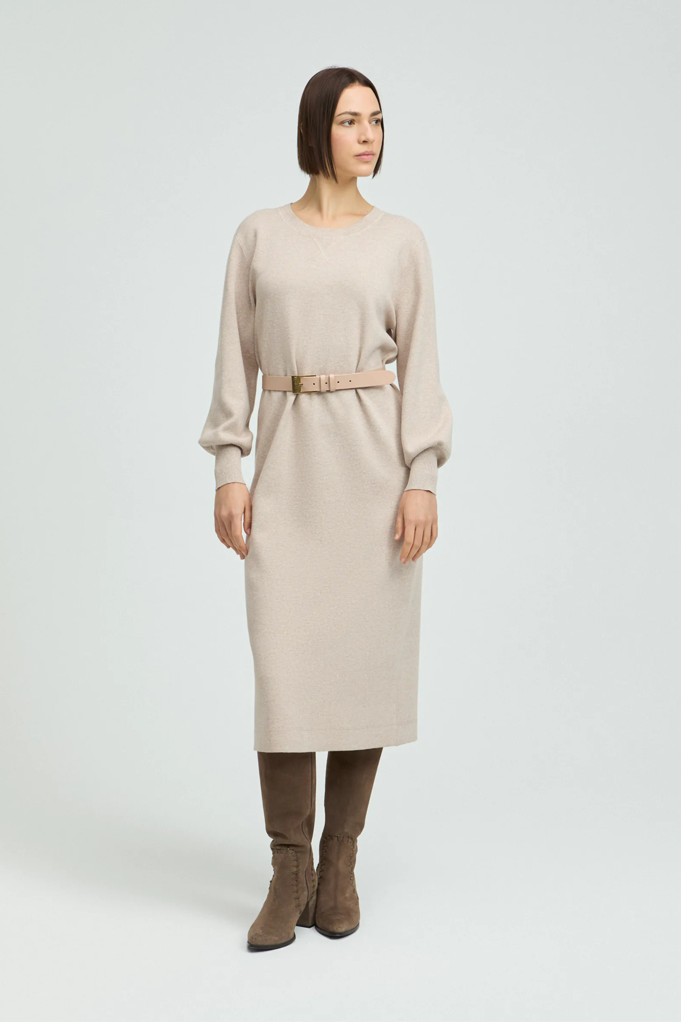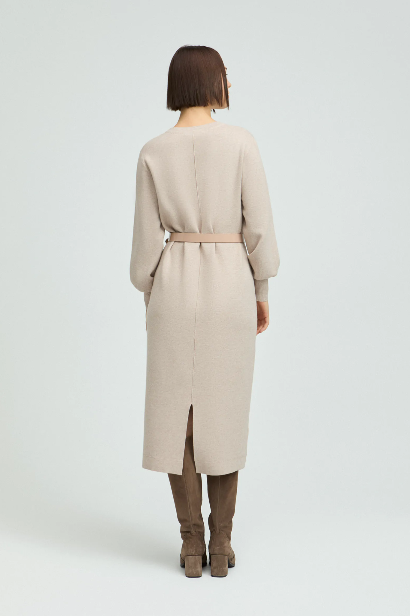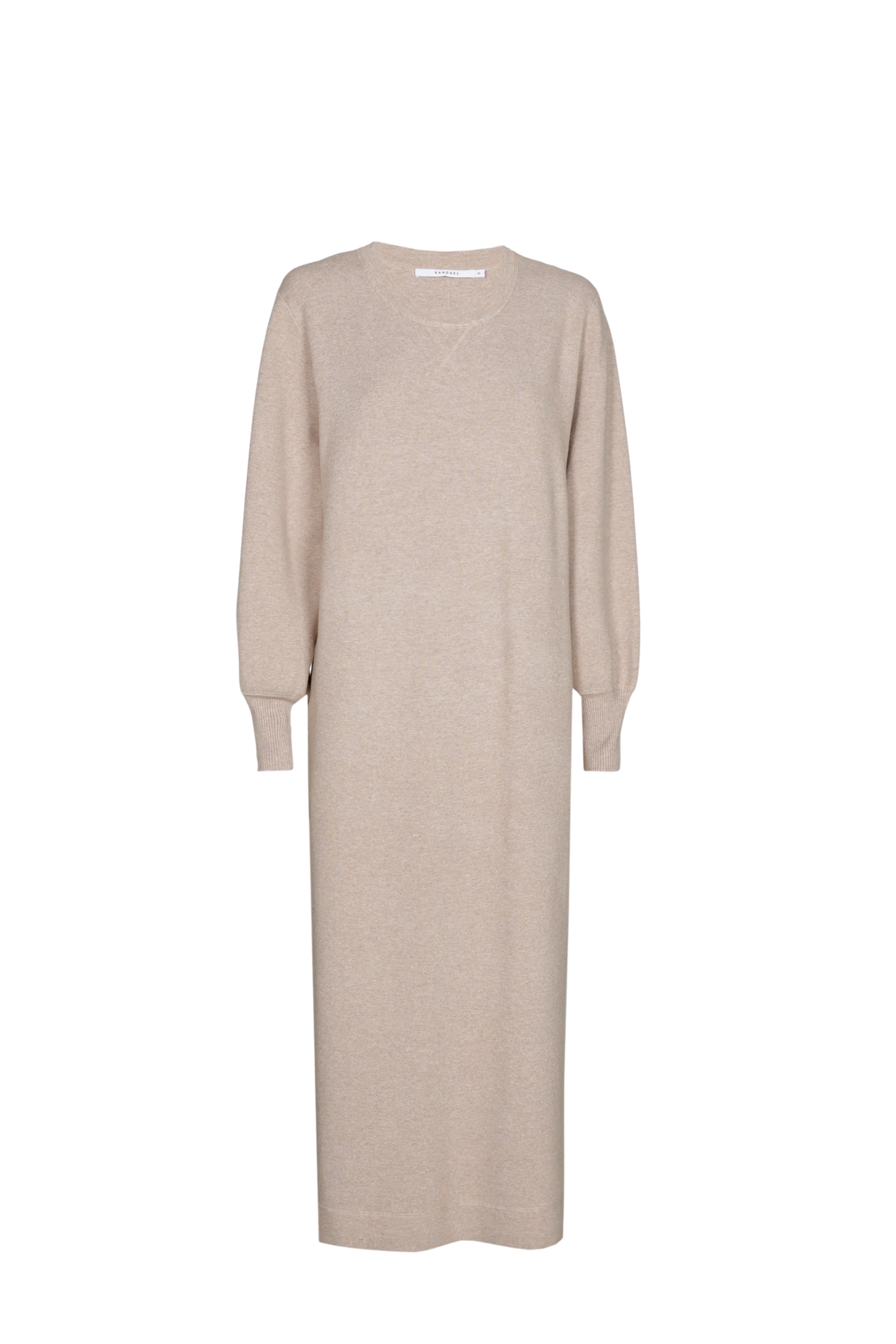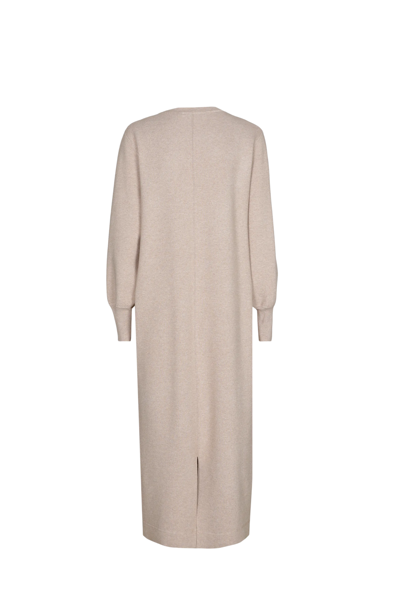De Arranka jurk van Xandres is een lange, rechte jurk in de kleur Cappuccino. De jurk heeft een ronde hals en is afgewerkt met hoge cuffs aan de mouwen. Een split achteraan en een subtiele naad op de rug zorgen voor extra elegantie en draagcomfort.