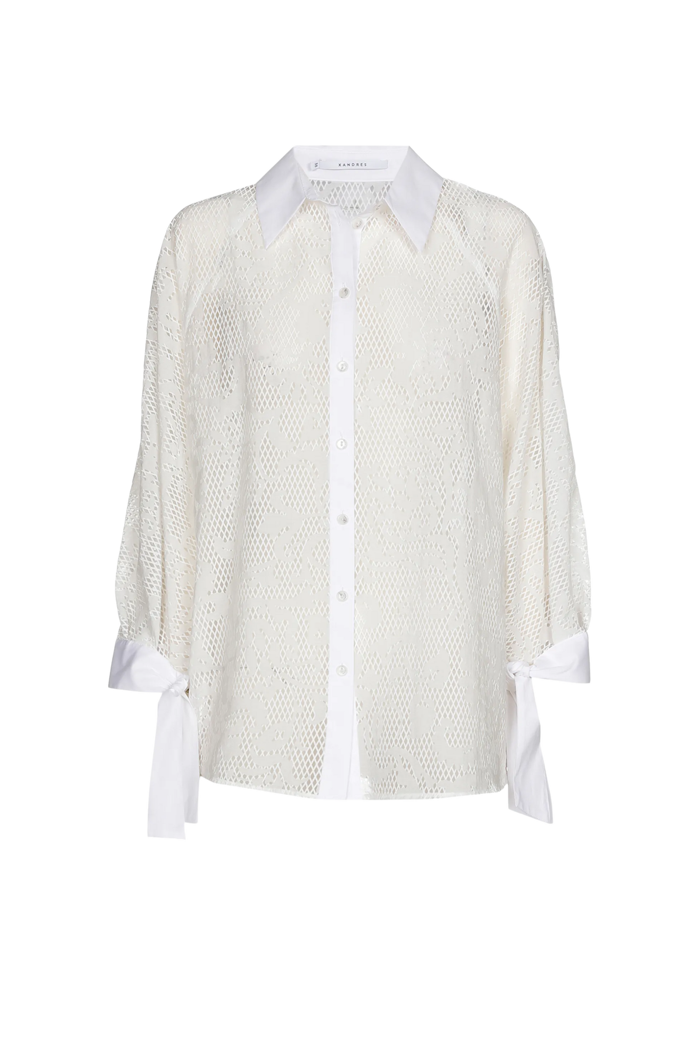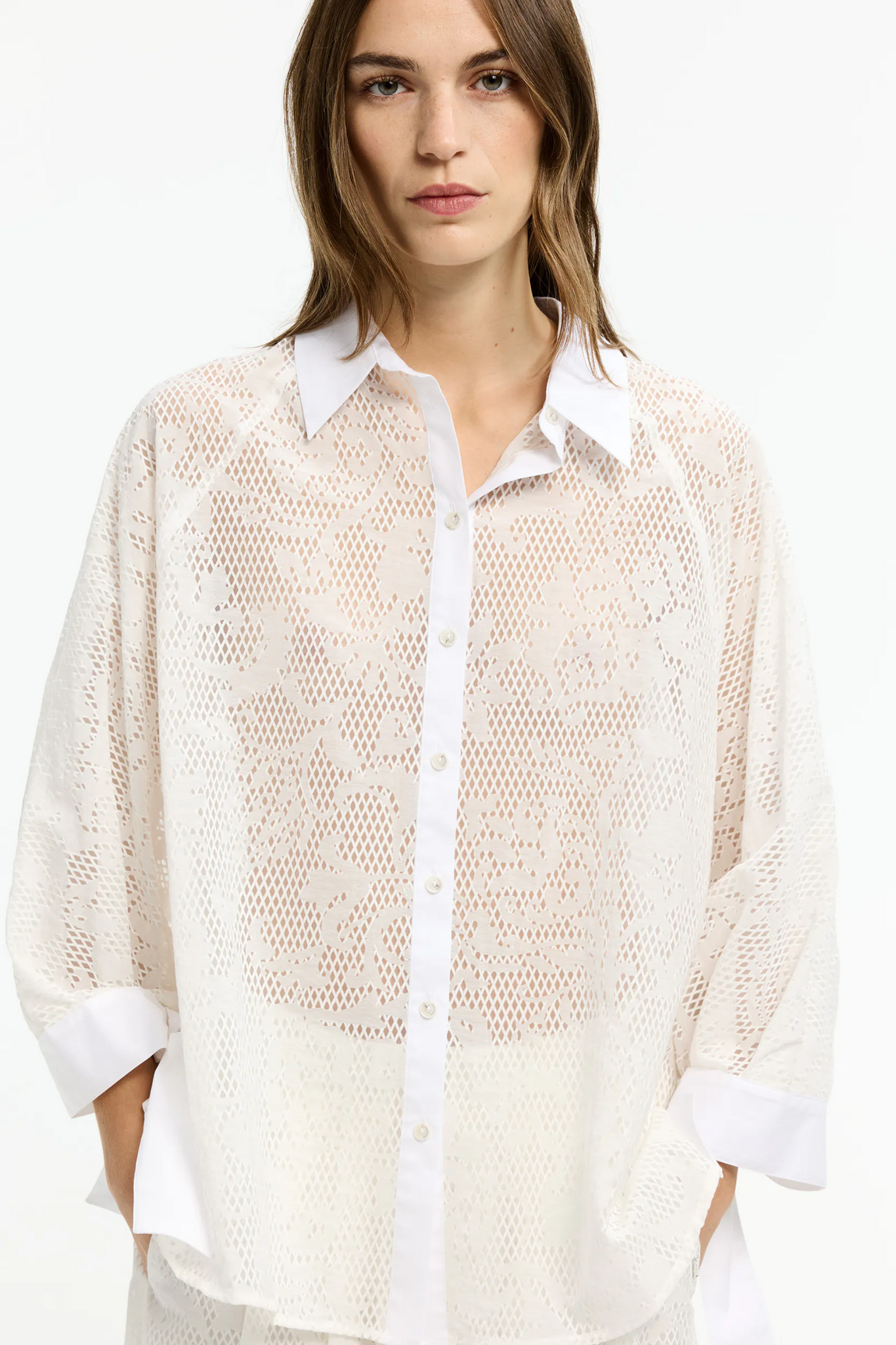 De Hirina Blouse van Xandres is een elegante blouse met een klassieke blousekraag en 3/4 vleermuis mouwen. Het model is uitgevoerd in een luchtige, opengewerkte stof met verfijnde broderie details voor een subtiel, vrouwelijk accent. De knoopsluiting aan de voorkant maakt het makkelijk om de blouse aan en uit te trekken en voegt een tijdloze touch toe. Combineer met de bijpassende rok voor een complete look!
