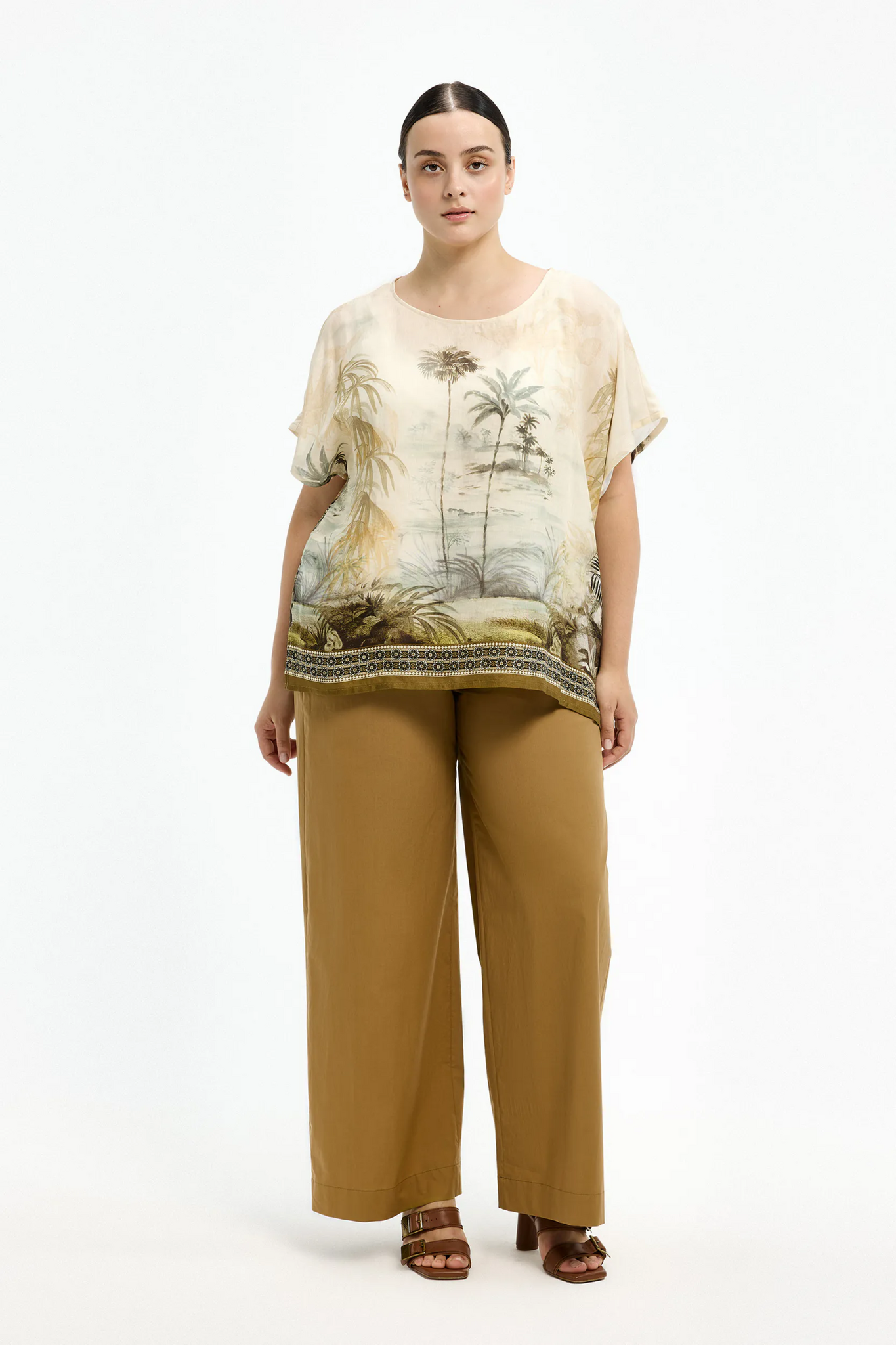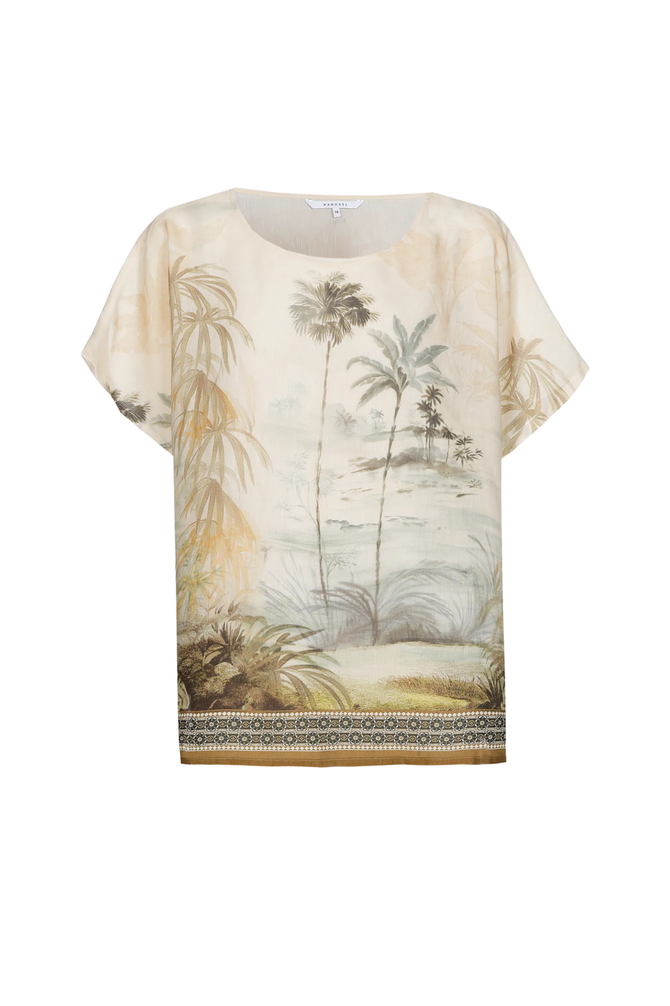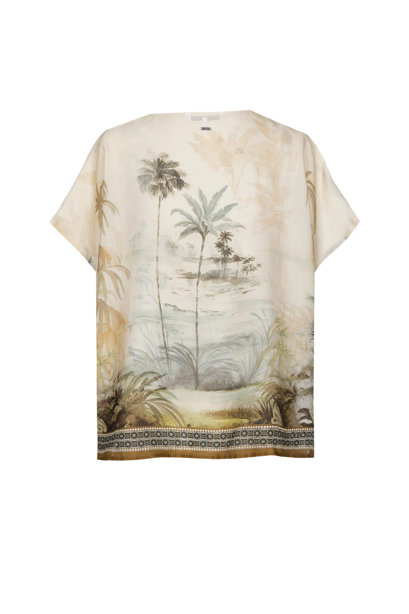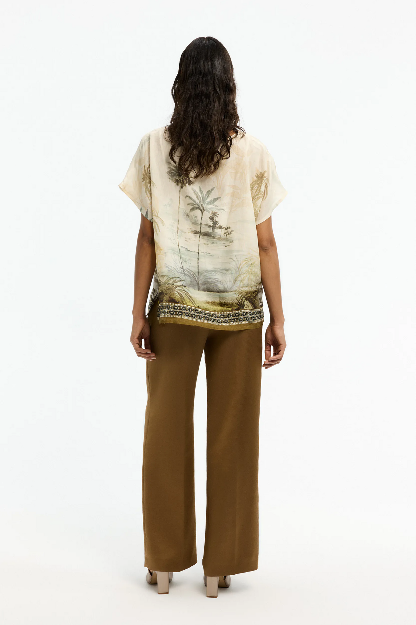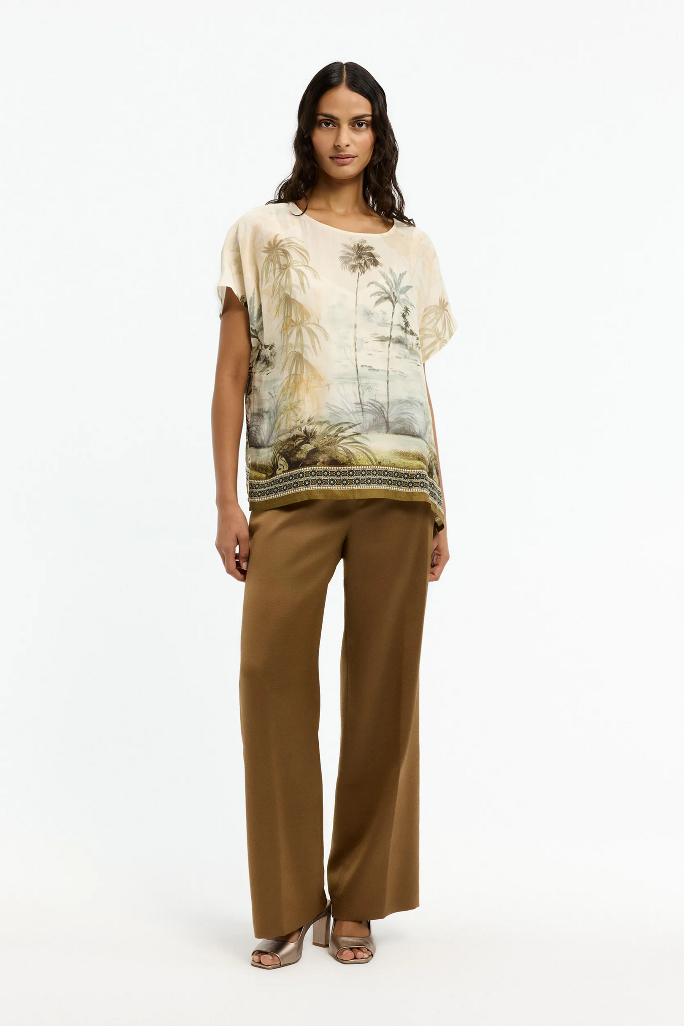 De Holo Blouse van Xandres is een luchtige, losvallende blouse met een ronde hals en korte mouwen met verlaagde schoudernaad. Het boxy model is uitgevoerd in een doorschijnende stof en heeft subtiele splitjes aan de onderkant, wat zorgt voor een speels effect. Perfect te combineren met de bijpassende rok voor een complete, elegante look.