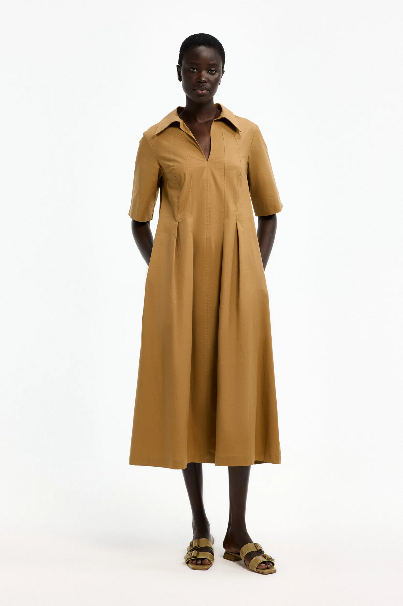 De Keyana Dress van Xandres is een elegante midi-jurk met een blousekraag, korte mouwen en een getailleerd bovenstuk met subtiele plooidetails. De A-lijn rok valt soepel en is voorzien van praktische zakken in de zijnaad. De soepele stof zorgt voor hoog draagcomfort en een vloeiende pasvorm, waardoor deze jurk geschikt is voor zowel dagelijkse als feestelijke gelegenheden.