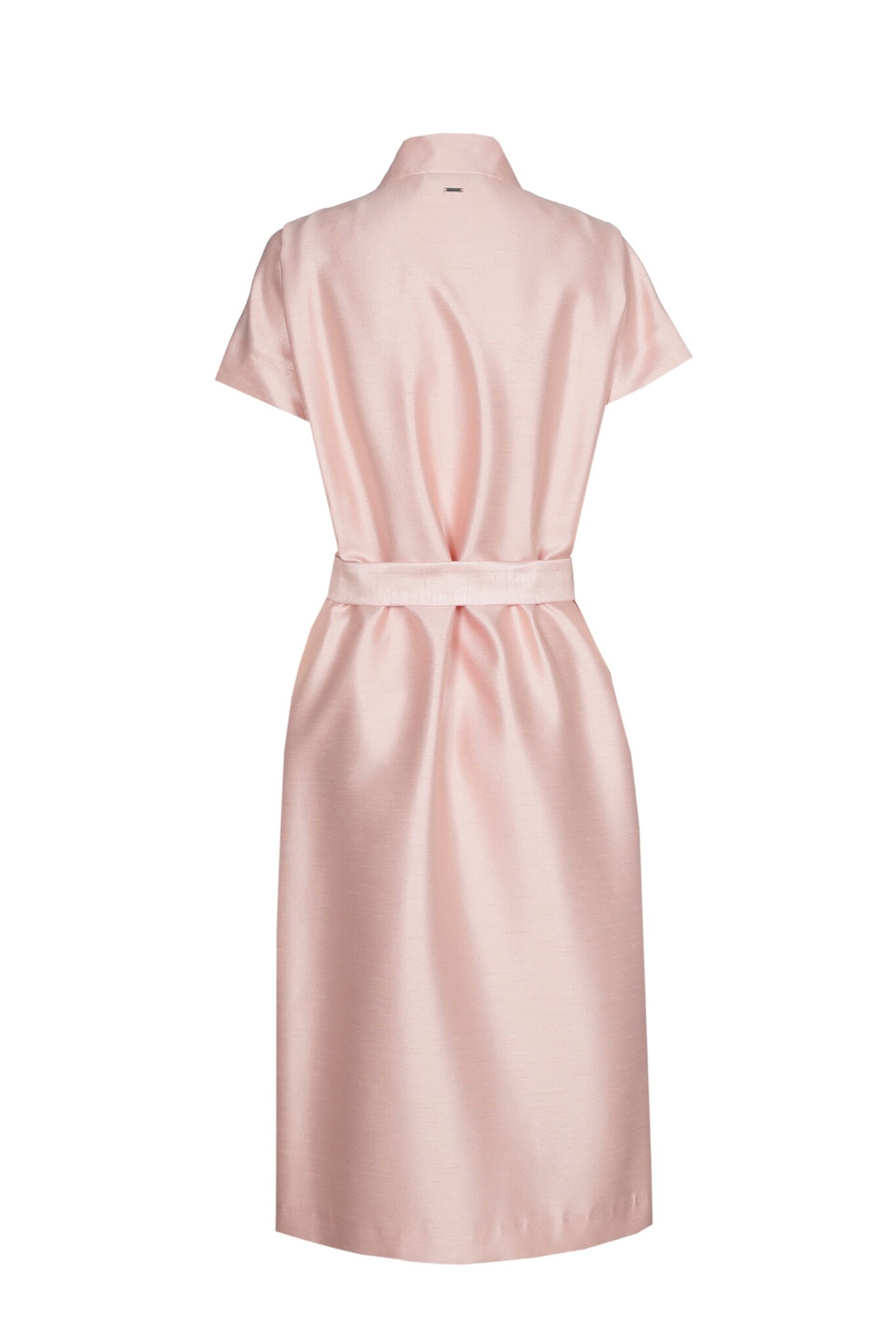 Het Xandres Koji Dress in Smoky Pink is een toonbeeld van luxe en verfijning, vervaardigd uit hoogwaardige zijde. Deze kuitlange jurk heeft een elegante hoge hals en korte mouwen, gecombineerd met een verborgen doorlopende knoopsluiting voor een minimalistische look. Dankzij het bijpassende ceintuur in de taille wordt een vrouwelijk silhouet gecreëerd dat zowel chic als tijdloos is.
