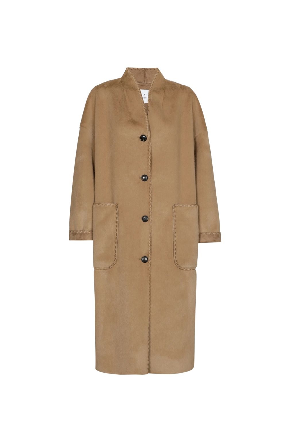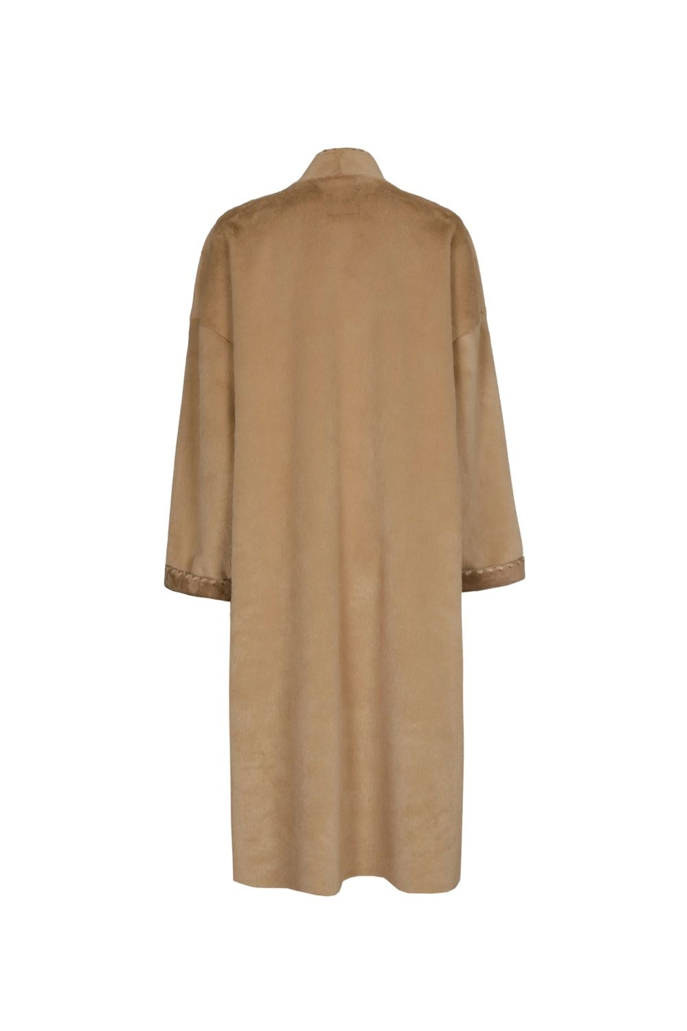 De Mala Jacket van Xandres is een lange jas in een cappuccinokleur. Het item heeft een V-hals en een doorlopende knoopsluiting. De jas is gemaakt van een zachte faux-fur stof en heeft lange mouwen. Grote steekzakken en verfijnde stiksels langs de naden zorgen voor een unieke afwerking. De jas valt tot op de kuit.