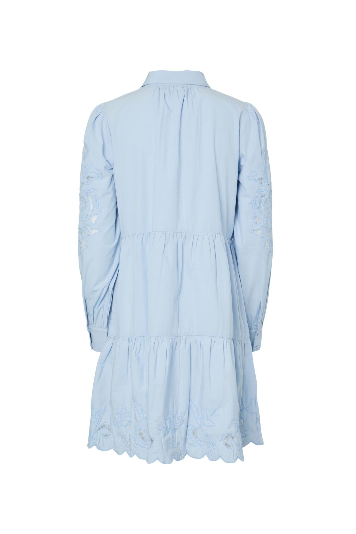 De YAS Zimia LS Shirt Dress in Skyway is een betoverende lichtblauwe doorknoopjurk die klassieke elegantie combineert met romantische details. Deze mini-jurk valt op door het fijne ajour-borduurwerk op de borst, mouwen en langs de onderzijde, wat zorgt voor een luchtige en luxe uitstraling. Met een nette kraag, lange mouwen met manchetten en een speelse gelaagde rok met geschulpte zoom is dit de perfecte jurk voor een stijlvolle lentedag.